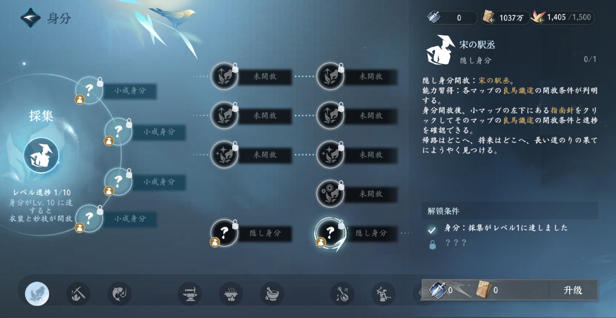 奇遇完了後、「メニュー - 身分 - 採集 - 技芸ページ」を開き、右下に隠し身分「宋の駅丞」が表示されるので、タップしてその身分をレベルアップさせます。