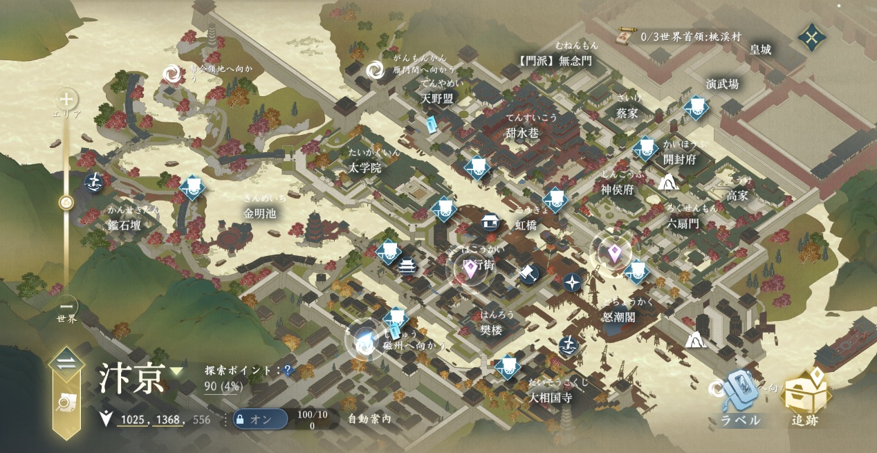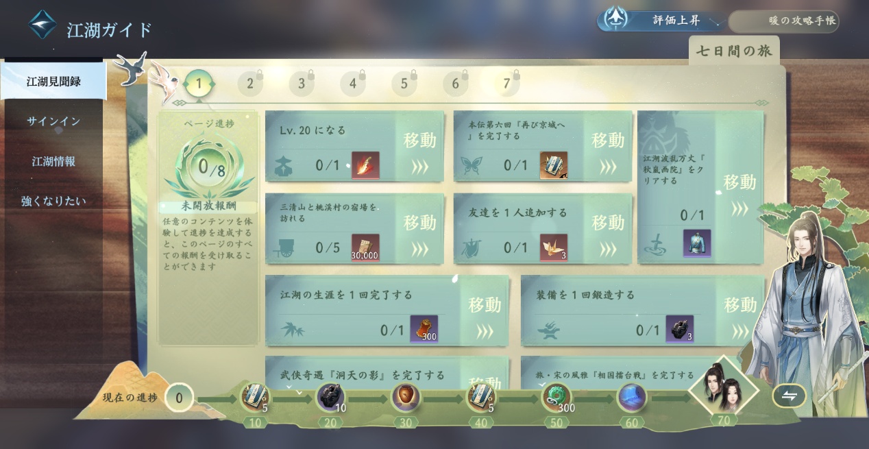 自由すぎて目標がない、何をすればいいか分からないと感じたら、メイン画面上部の「江湖ガイド」を開き、「江湖見聞録」から「七日間の旅」に従って進めればOKです。