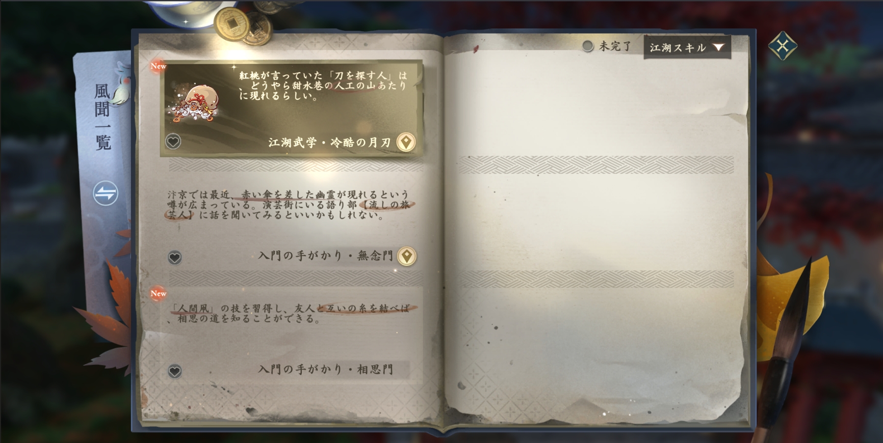 江湖に根も葉もない噂はありません。どの風聞も失われた武学への道標となりえます。プレイヤーは風聞システムで【江湖スキル】カテゴリーを選び、手がかりを得て、指定場所でNPCと深く関わることで、風聞の裏に隠された真実を明らかにしていきます。