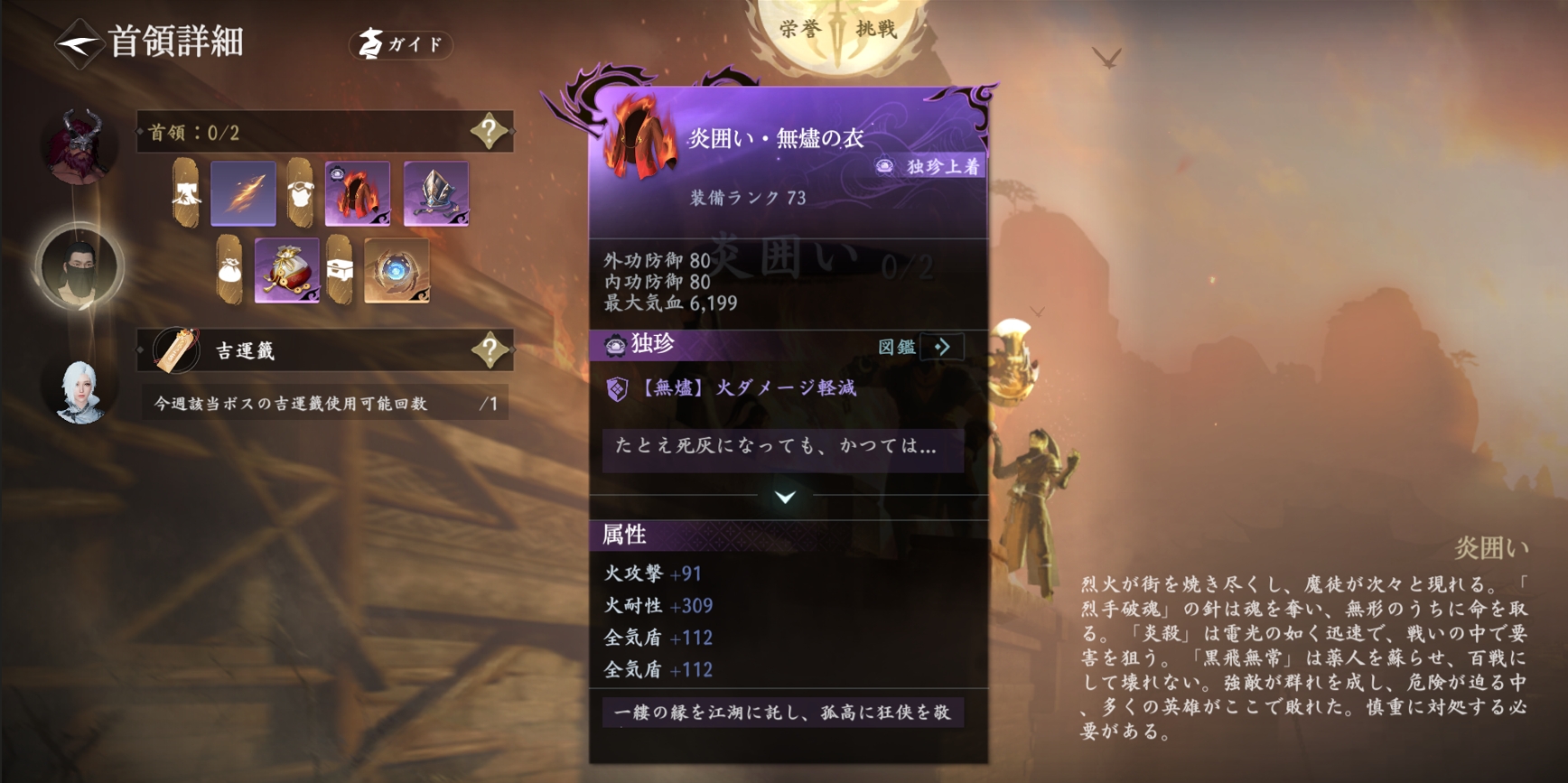 次は甕城で魔天の薬人の包囲に立ち向かうことになります。精鋭薬人をすべて倒し、甕城を突破すれば、外観「赤焔流光」と独珍装備「無烬衣」を獲得するチャンスが訪れます。危機的状況で火元素耐性を大幅に上昇させ、火攻撃能力も高められます。
