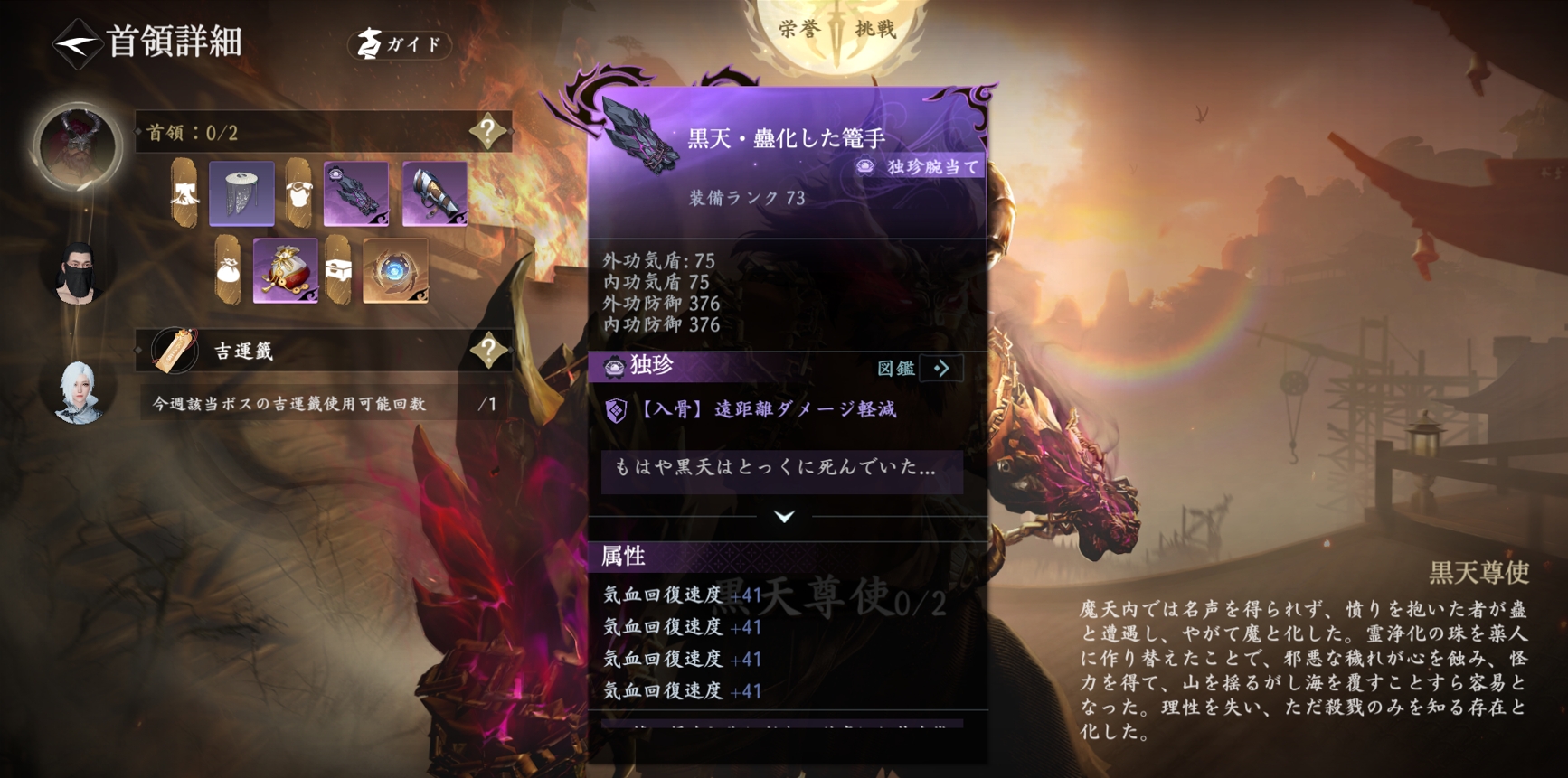 黒天はもとは磁州陶陶町の村人だったが、騙されて魔天に加わり、薬人に変えられ、終わりなき苦痛に苛まれています。彼を倒せば、一定の確率で外観「瓊亭望月」と独珍装備「黒天・蠱化の籠手」を獲得します。遠隔ダメージを大幅に軽減し、気血回復効果も大量に得られます。