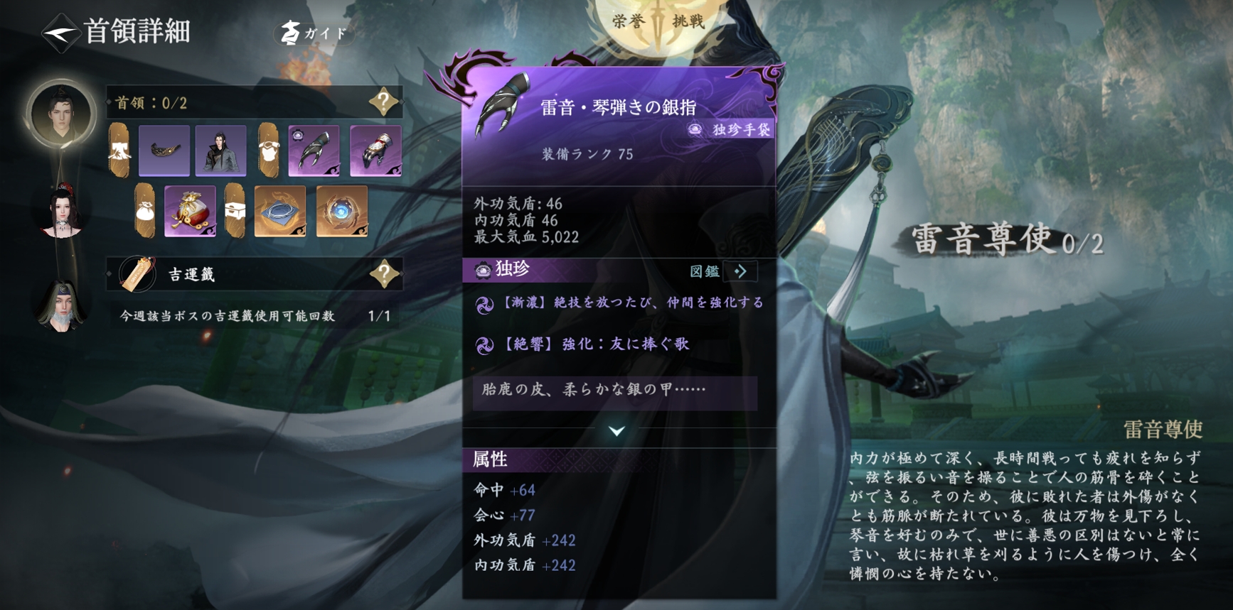 雷音尊使は人の心を持たず、理由もなく命を奪い、ただ己の愉悦のためだけに動きます。共に一曲奏でながら、曲に潜む殺意に注意してください。撃破すれば一定の確率で独珍装備「雷音・鼓琴銀指」が手に入ります。絶技を放つとチーム全員の会心が上昇し、絶技「友に捧ぐ歌」発動時には仲間の軽功回復速度も追加で向上します。