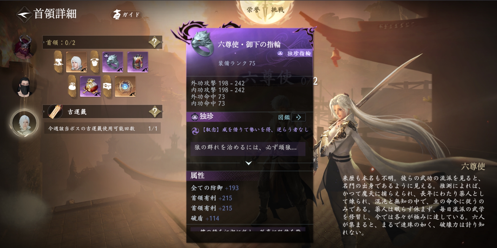 薬人六尊使は皆、名門の出身だが、魔天に攫われ、長い年月をかけて薬人と化し、主の命令にのみ従います。彼らを倒せば、狼の頭が刻まれた「六尊使・馭下の指輪」を手に入れる可能性があります。逃げようとする標的により高いダメージと妨害効果を与えます。