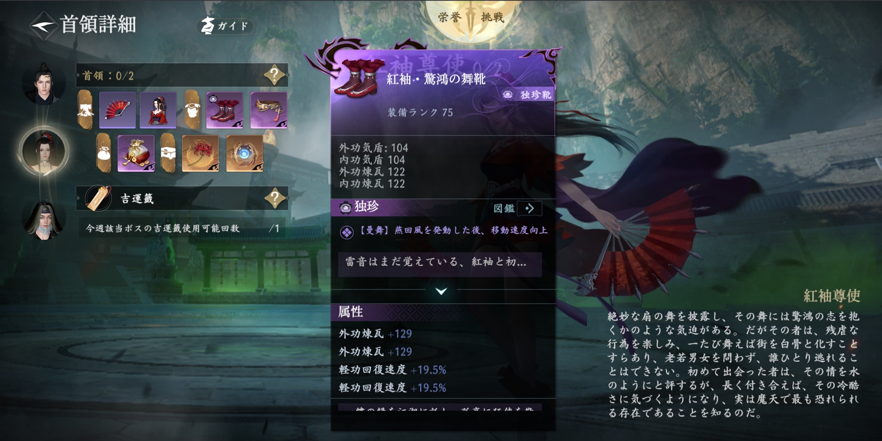 同様に、紅袖尊使の優美な扇の舞に惑わされてはなりません。むしろ彼女は観客すべてを残虐に扱い、悲鳴を聞くことを望んでいます。撃破すれば一定の確率で独珍装備「紅袖・驚鴻の舞靴」が手に入ります。燕回風を放つと移動速度が向上します。