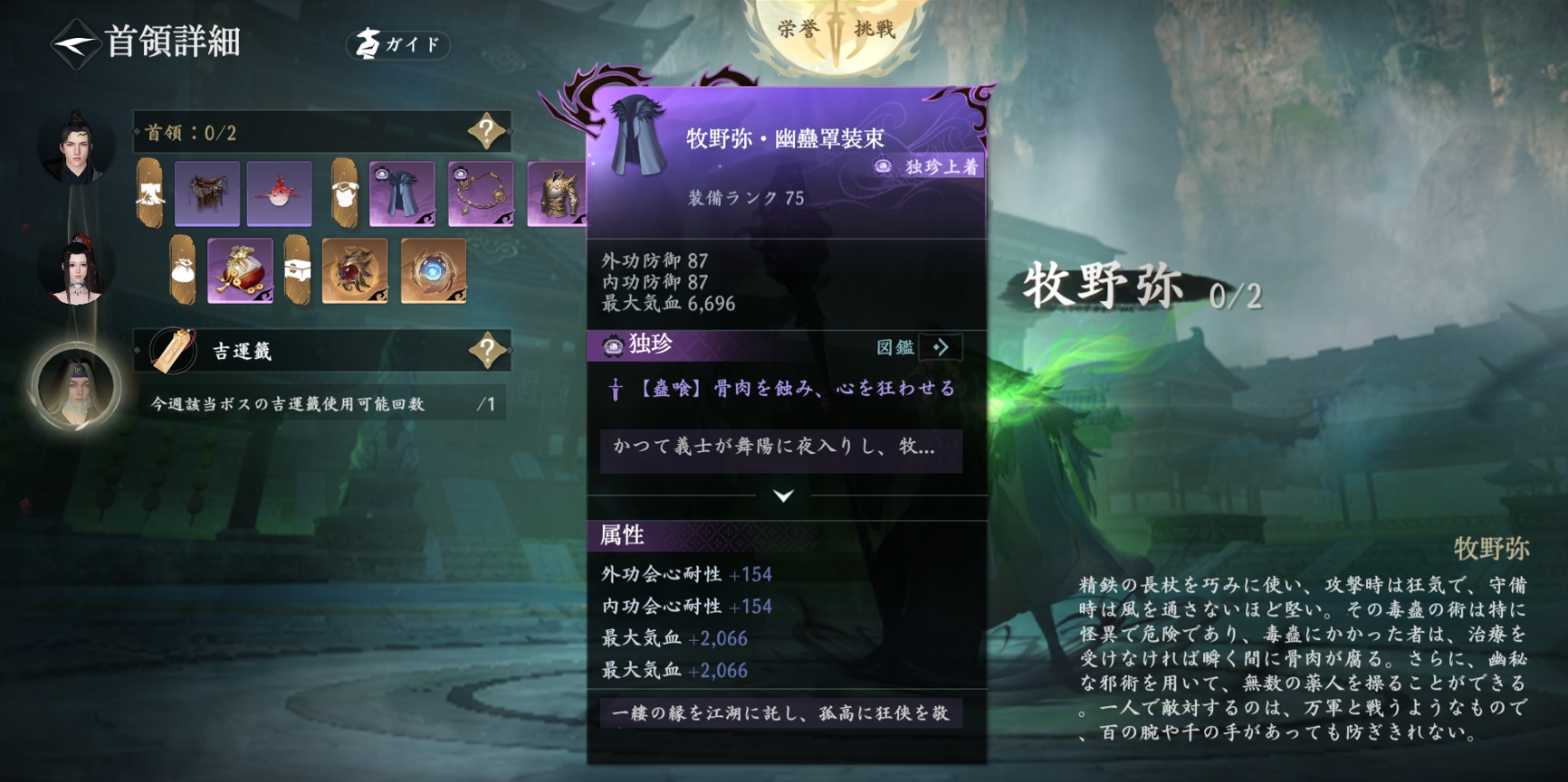 魔天の主・牧野弥。「雲起台千人殲滅」「舞陽城全城薬人化」の首謀者。撃破すれば一定の確率で独珍装備「牧野弥・幽蠱の外套」が手に入ります。気血70%以上の標的には5%の追加ダメージ、30%以下の標的には重傷を付与します。