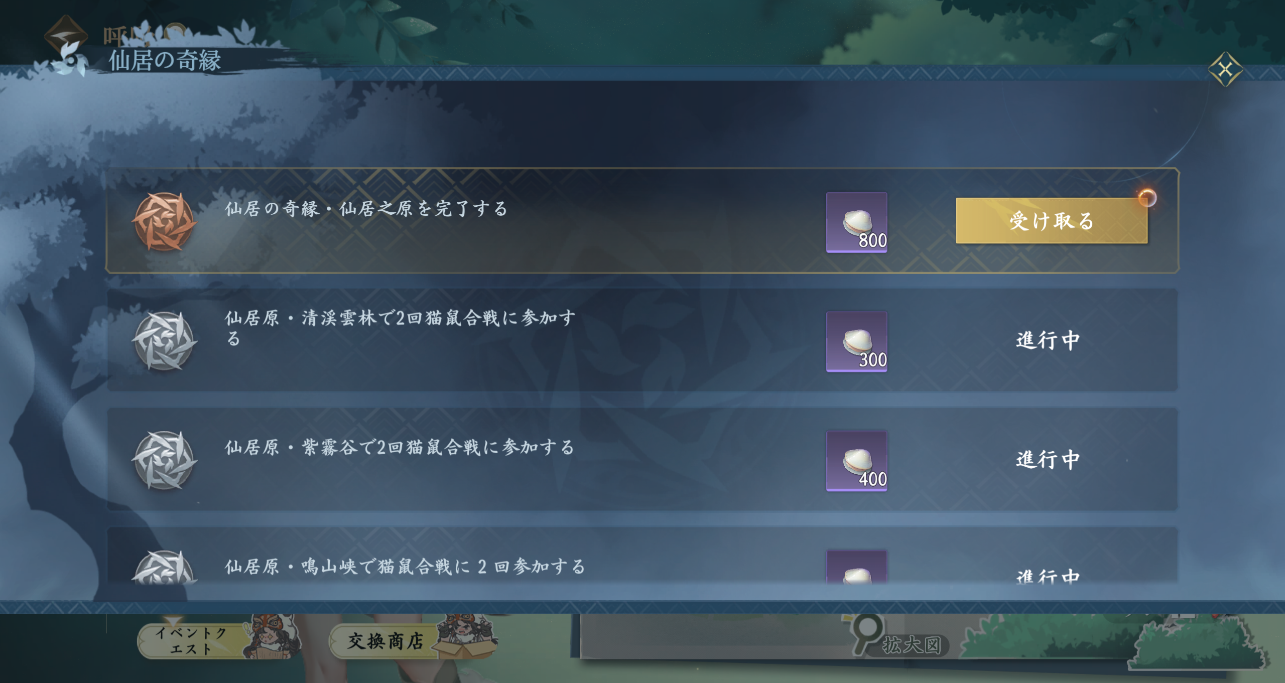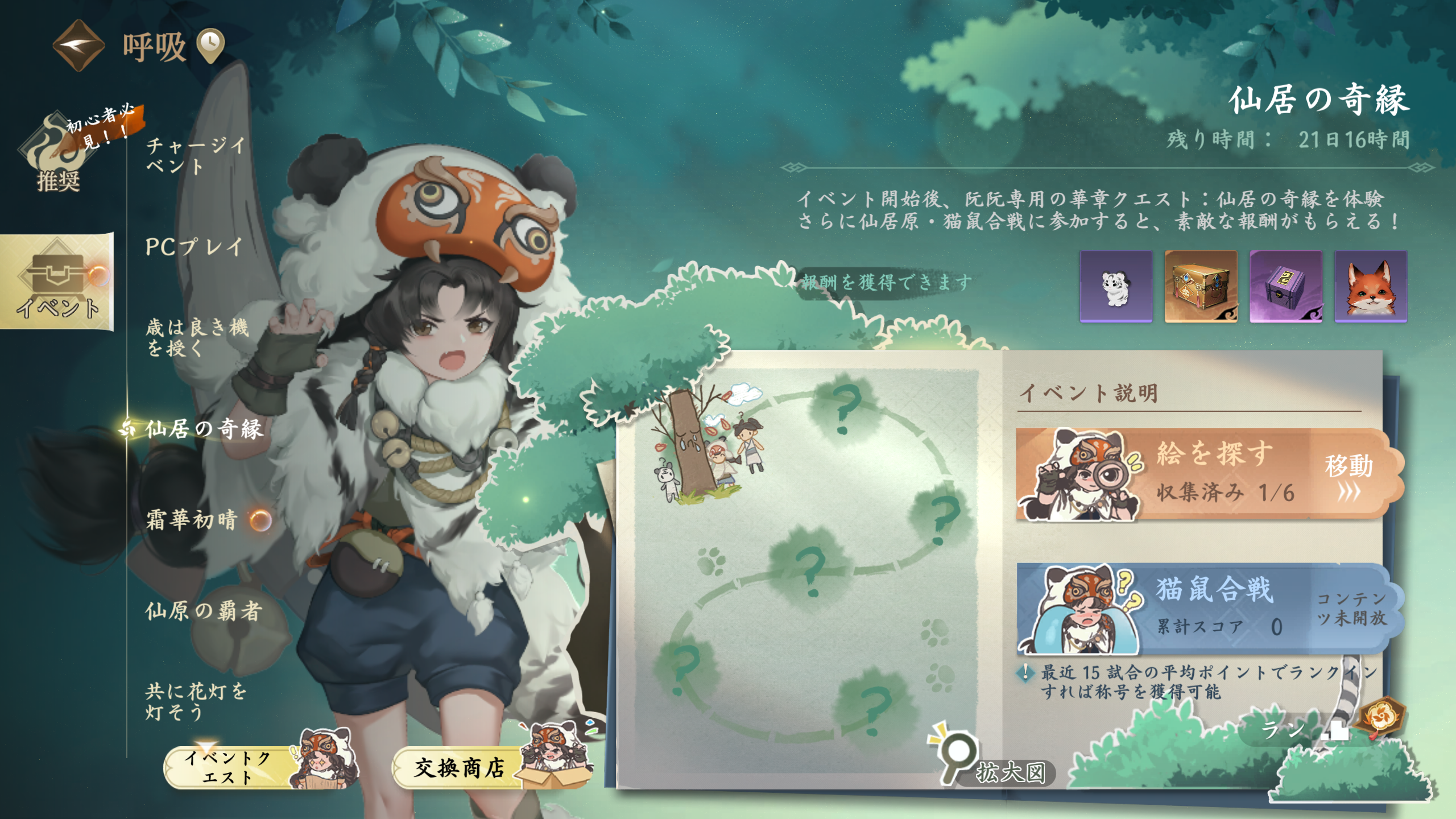猫鼠合戦に参加すると専用トークン「にゃんこ貝」を獲得でき、累計ポイントでランキング上位を狙えば限定称号も手に入ります。報酬は「仙居の奇縁-交換商店」で豪華アイテムと交換できます: