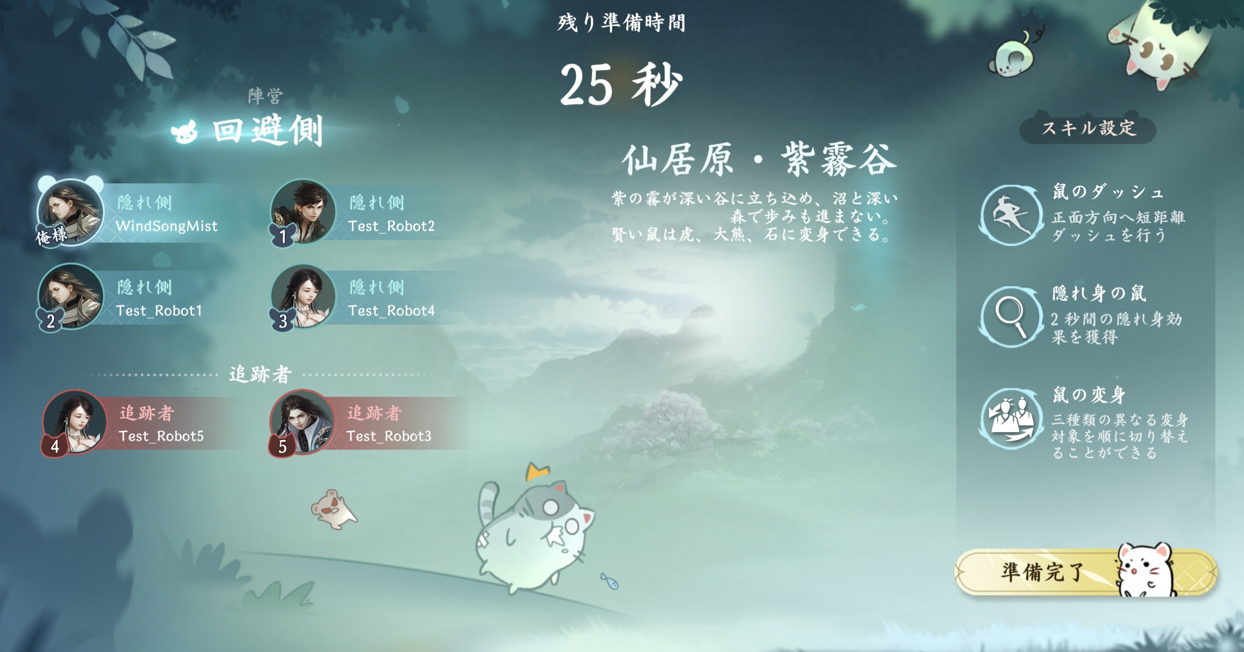 ① 準備段階:マッチング完了後、30秒間の準備時間に入ります。この間「賢い鼠」は先にマップ内で隠れ場所を探すことができ、「賢い猫」は前方の視野のみ確認可能で、行動を開始できません。