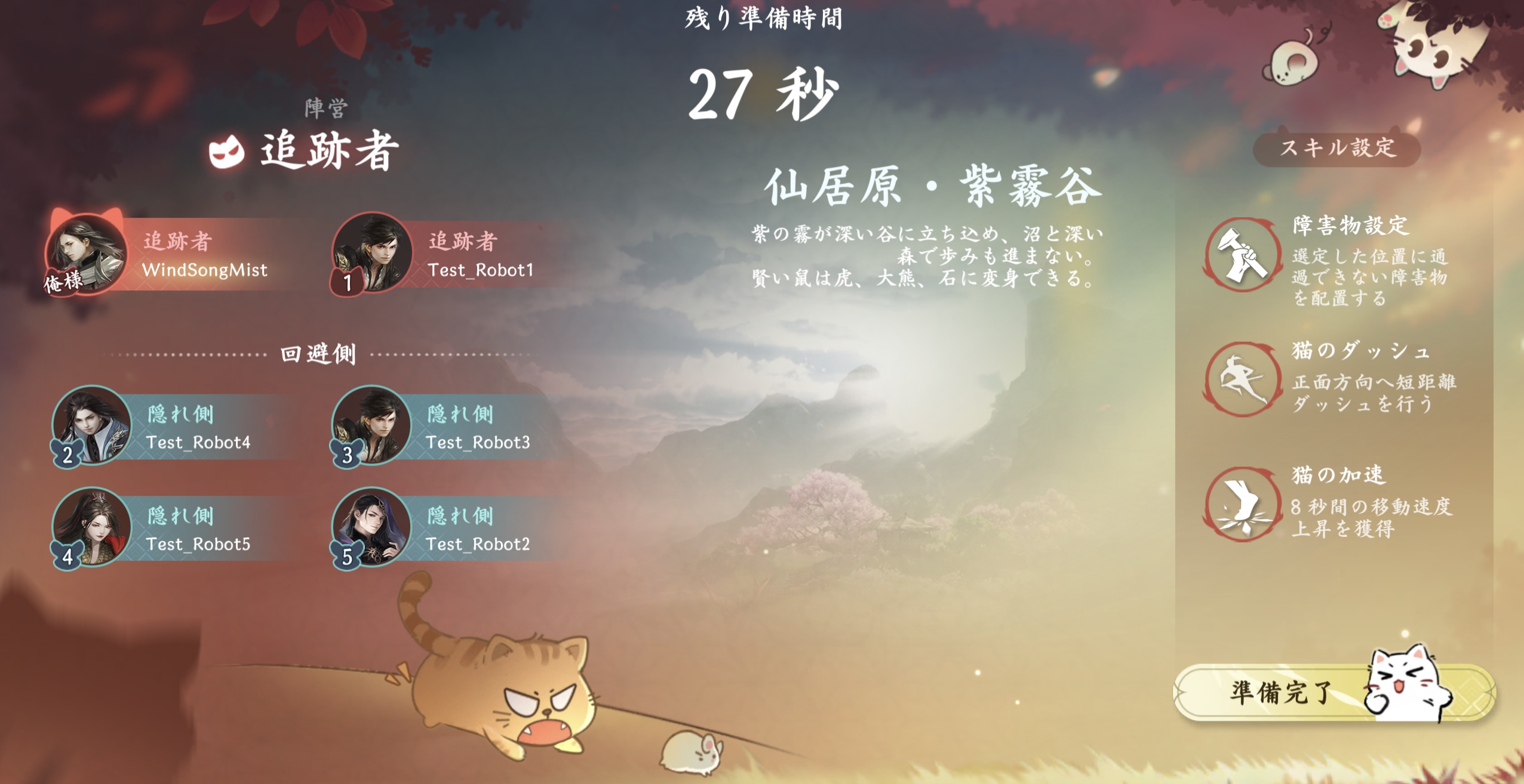 ・「隠れ身」(クールタイム30秒):一時的に姿を消し、その間「賢い猫」に直接発見されなくなります。