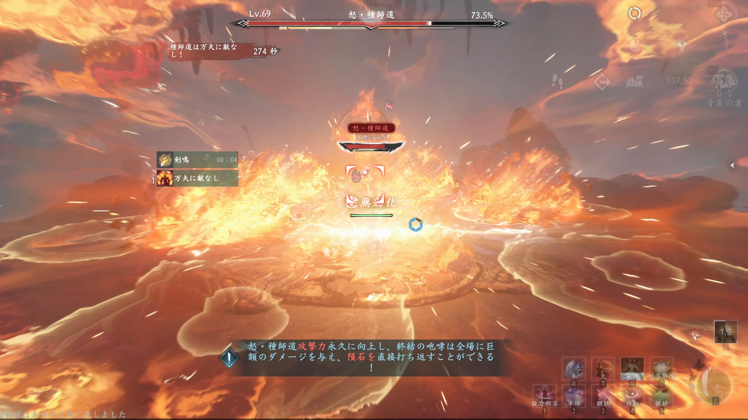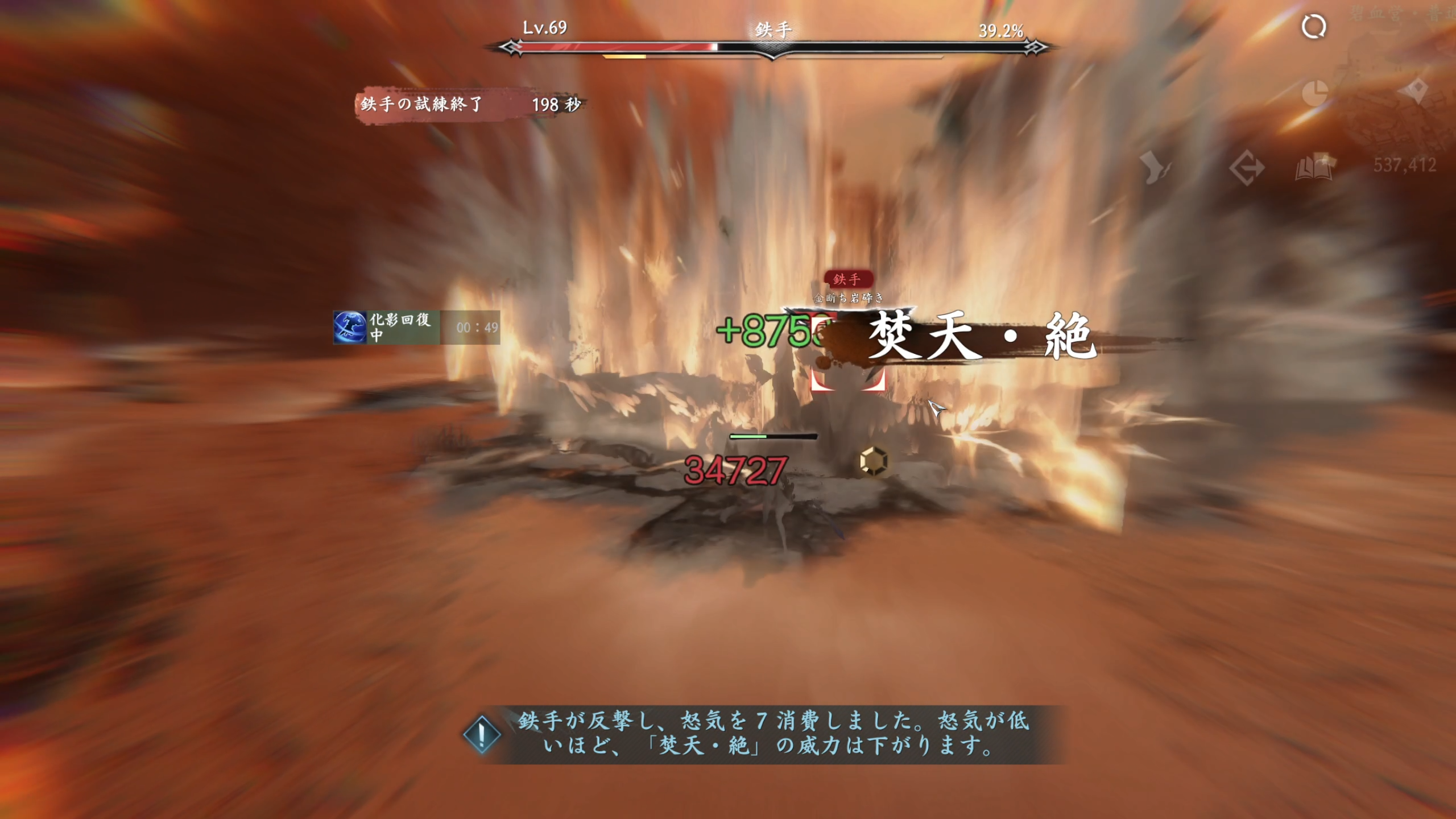 鉄手は【不動の禅心】を発動し、大部分のダメージを防ぎながら怒気を蓄積する。蓄積された怒気が多いほど、【焚天・絶】のダメージも高くなる。