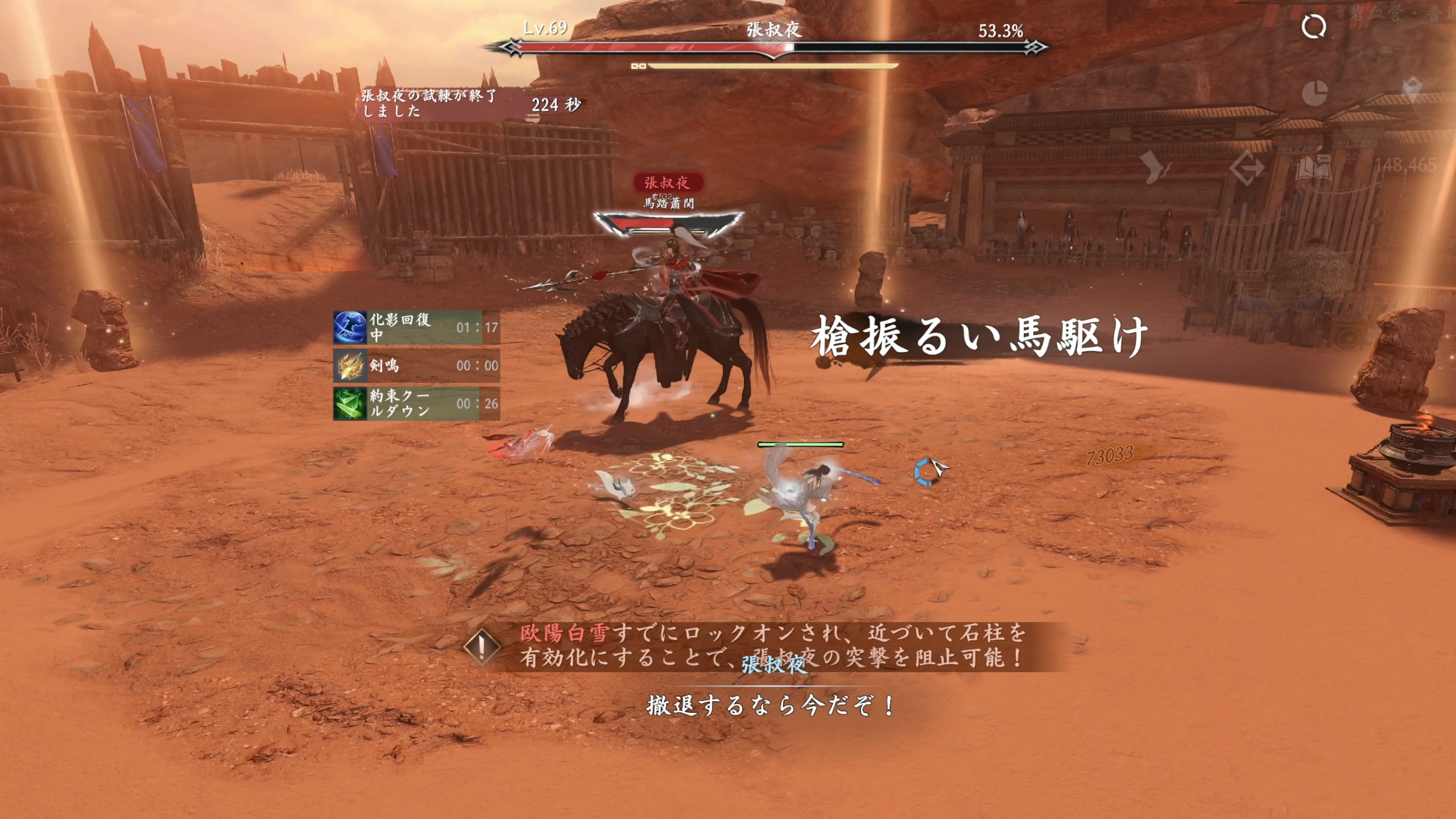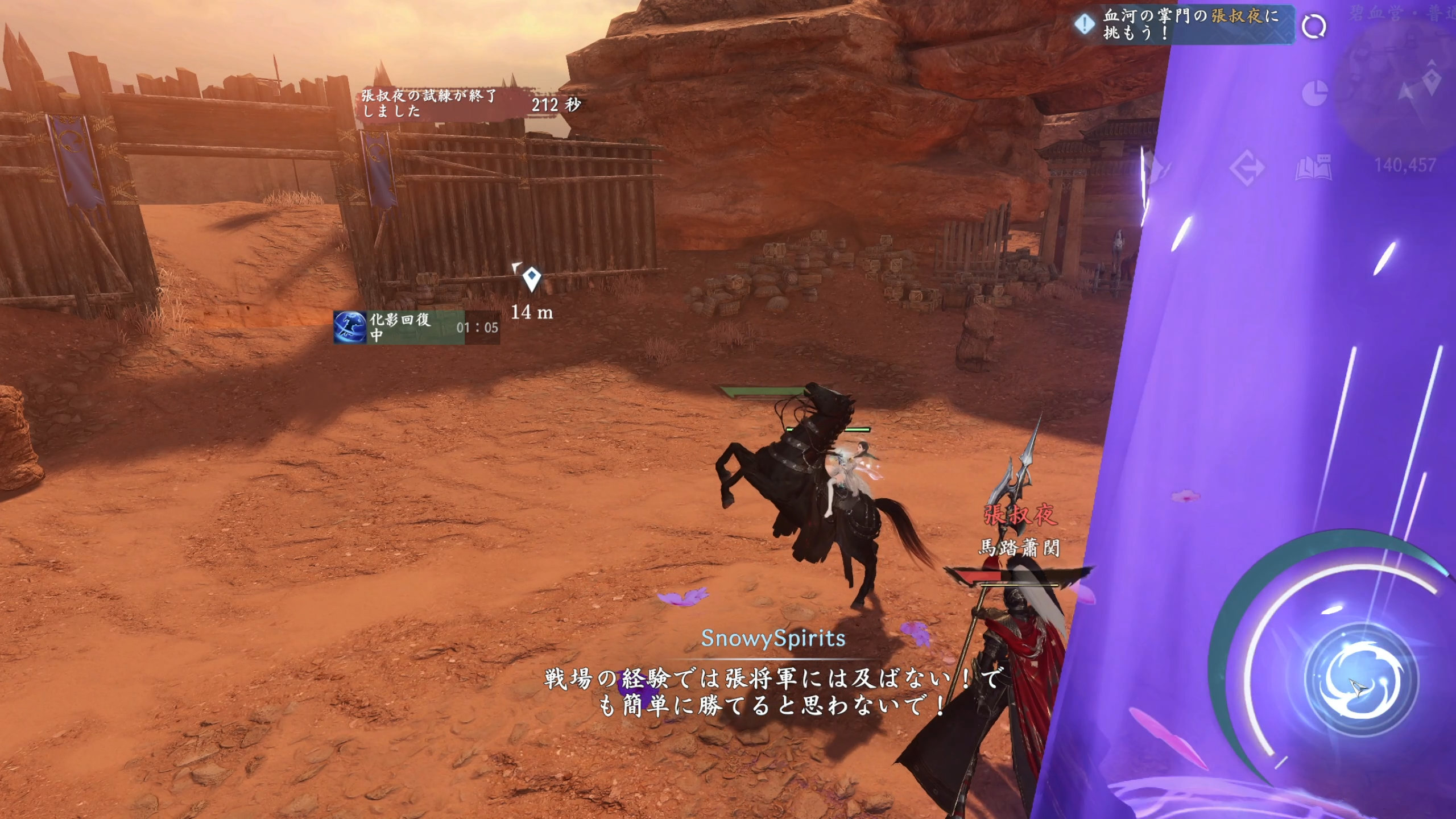 ロックオンされたプレイヤーは素早く遮蔽物を見つけ、エリア内の石柱やスキル(鉄壁、寒氷の護り、春華の祈りなど)を利用して突撃を回避しなければなりません。回避に成功すると、張叔夜は落馬し、徒歩戦闘形態になります。このとき、プレイヤーは張叔夜の馬を攻撃すると、その馬に乗って騎乗戦闘を行い、張叔夜に大ダメージを与えることができます。もし馬を攻撃しなければ、張叔夜はすぐに馬を呼び戻し、馬上戦闘に戻ります。