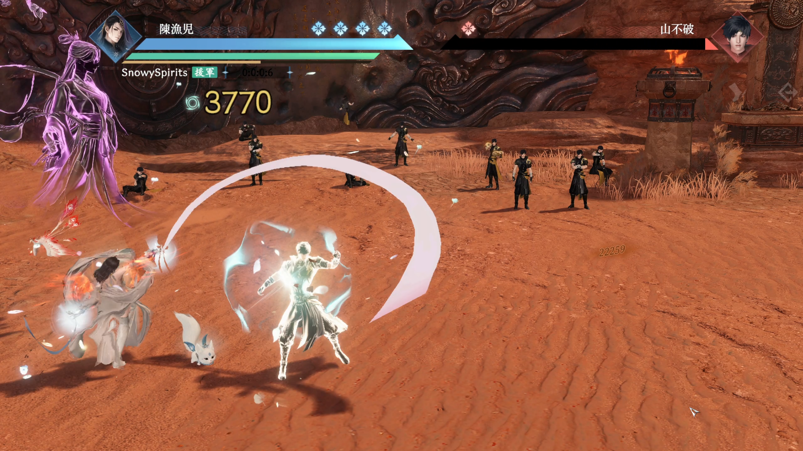 すぐに攻撃をやめ、鉄手の怒気の蓄積を防ぎます。その場には多くの石柱があり、これらの石柱を鉄手に向けて打ち込み、怒気の蓄積を中断させ、【焚天・絶】のダメージを減らしましょう。