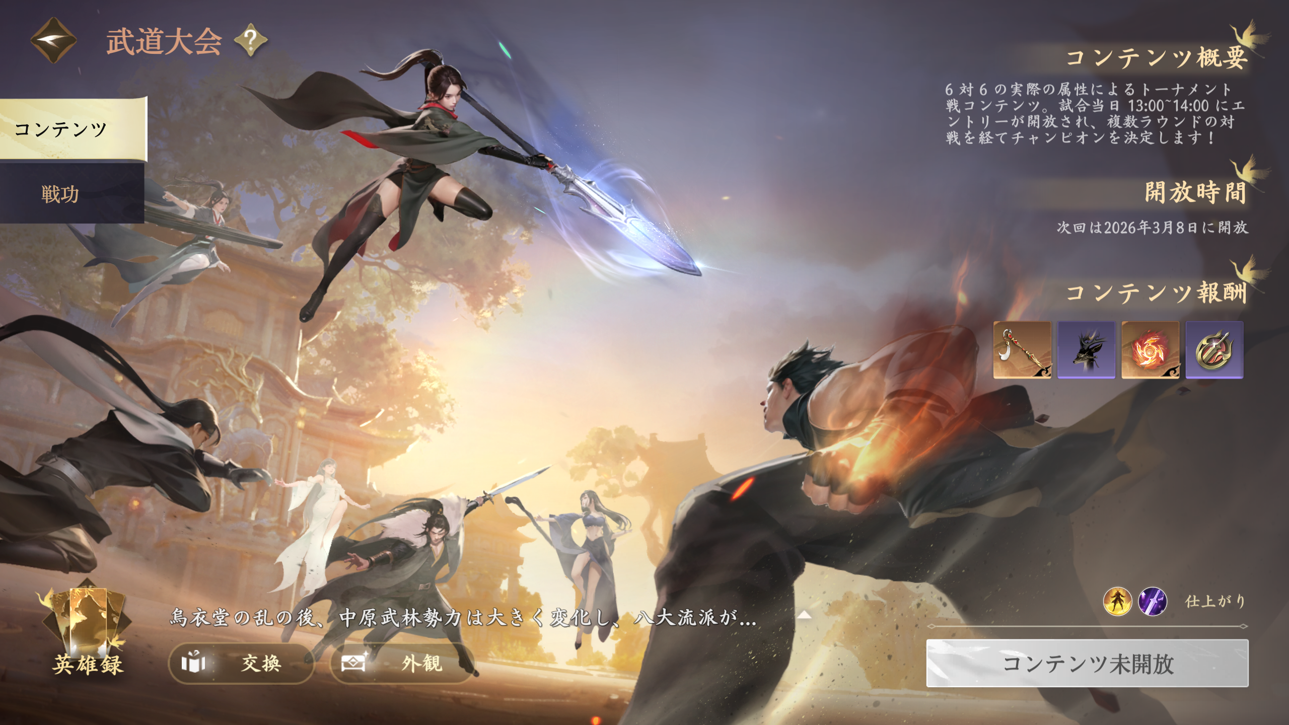 武道大会は6対6の対戦モードを採用し、プレイヤーの実際の属性をそのまま反映させ、内功、特技、妙技、独珍装備の効果が全て発動します。ここでは、操作で魅せることも、武学の組み合わせに対する独自の理解で優位に立つこともできます。千を越えるビルドの真剣勝負が明暗を分けるでしょう!