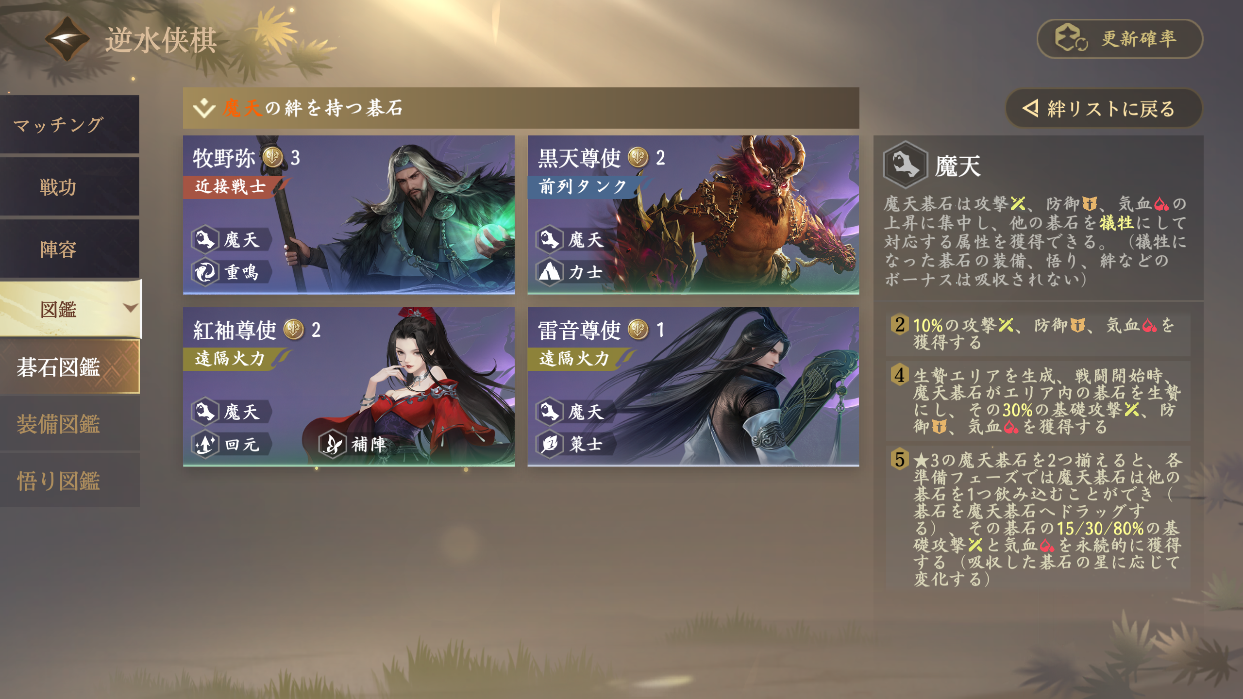 かつて舞陽城で苦戦を強いられた魔の軍団——「魔天」勢力も戦場に参加します。この集団は邪悪な力に満ち溢れ、かつて舞陽城で薬人を修練したように、「魔天」の絆は味方の碁石を修練し、自身の属性を永続的に強化できます。もし「魔天」が「万職の書」を通じて他の碁石を魔天勢力へと侵食し、5人の魔天陣形を組み上げると、その邪悪な力は最大となり、碁石を直接飲み込むことさえできます!