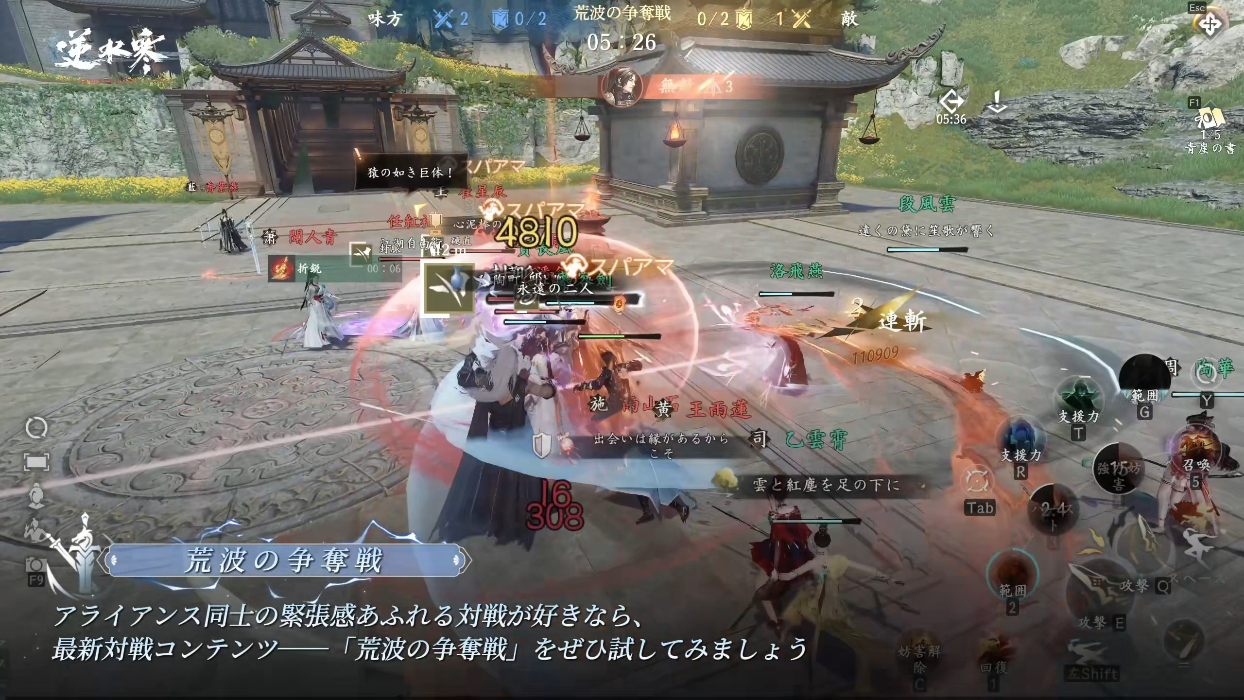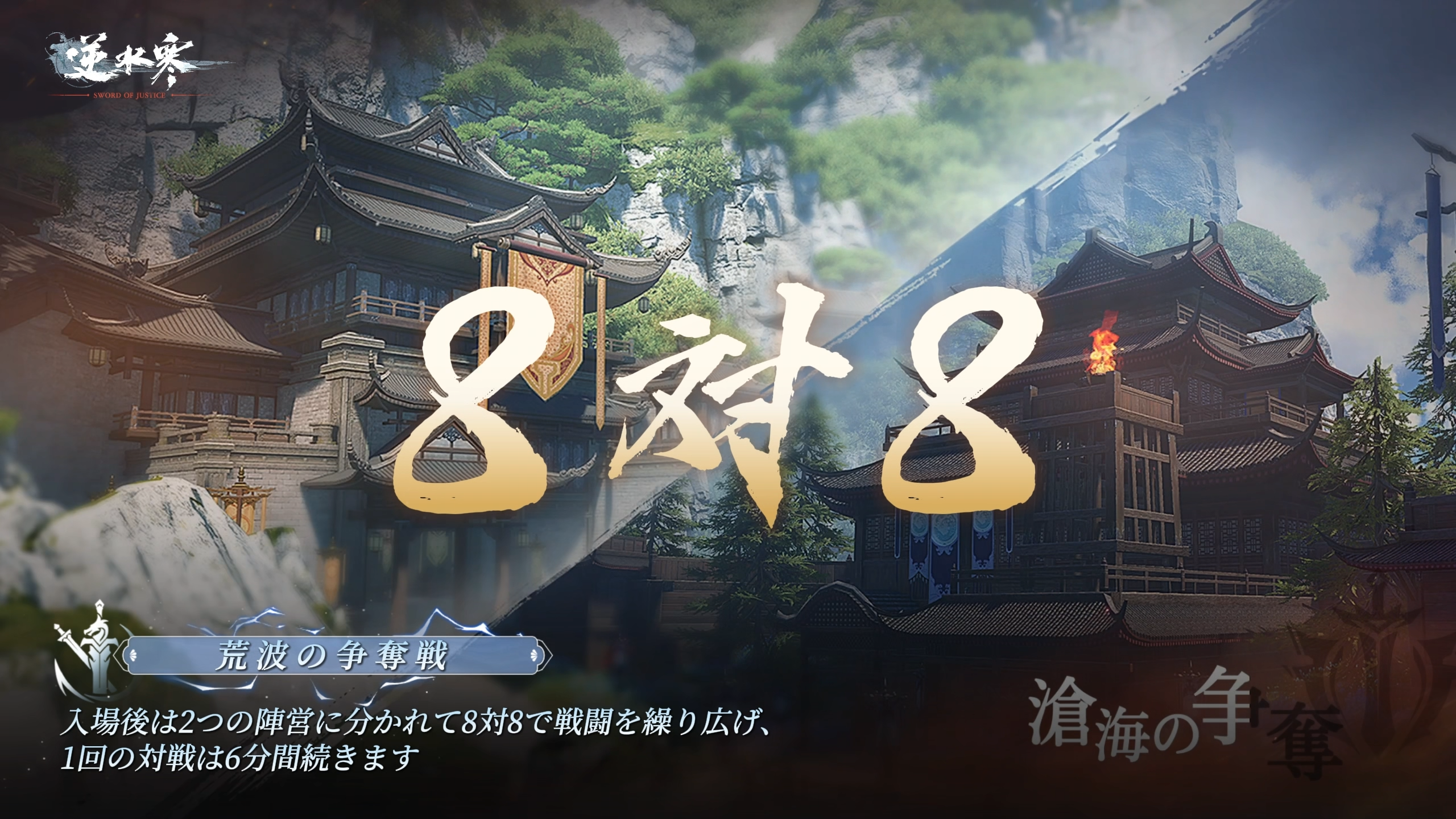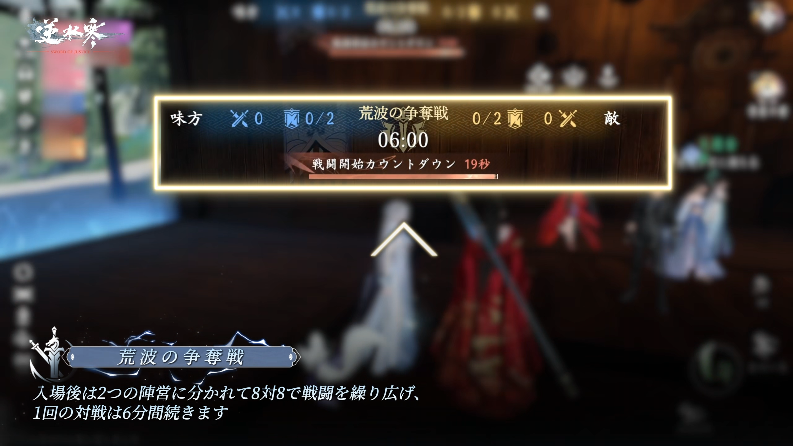 荒波の争奪戦の戦場では、プレイヤーたちは盈玉楼と怒涛閣の2つの陣営に分かれて対決し、1試合は最大6分間継続します。両陣営の旗は味方拠点の軍旗室に更新されます。相手の軍旗室へ突入して旗を奪い、味方の軍旗室へ持ち帰り、かつ味方の旗が奪われていなければ、旗奪い1回完了となります。カウントダウン終了時、旗奪取数が多い陣営が勝利します。数が同じだった場合は総撃破数、総ダメージ量が比較されます。旗を2本奪取すれば、早期勝利となります。