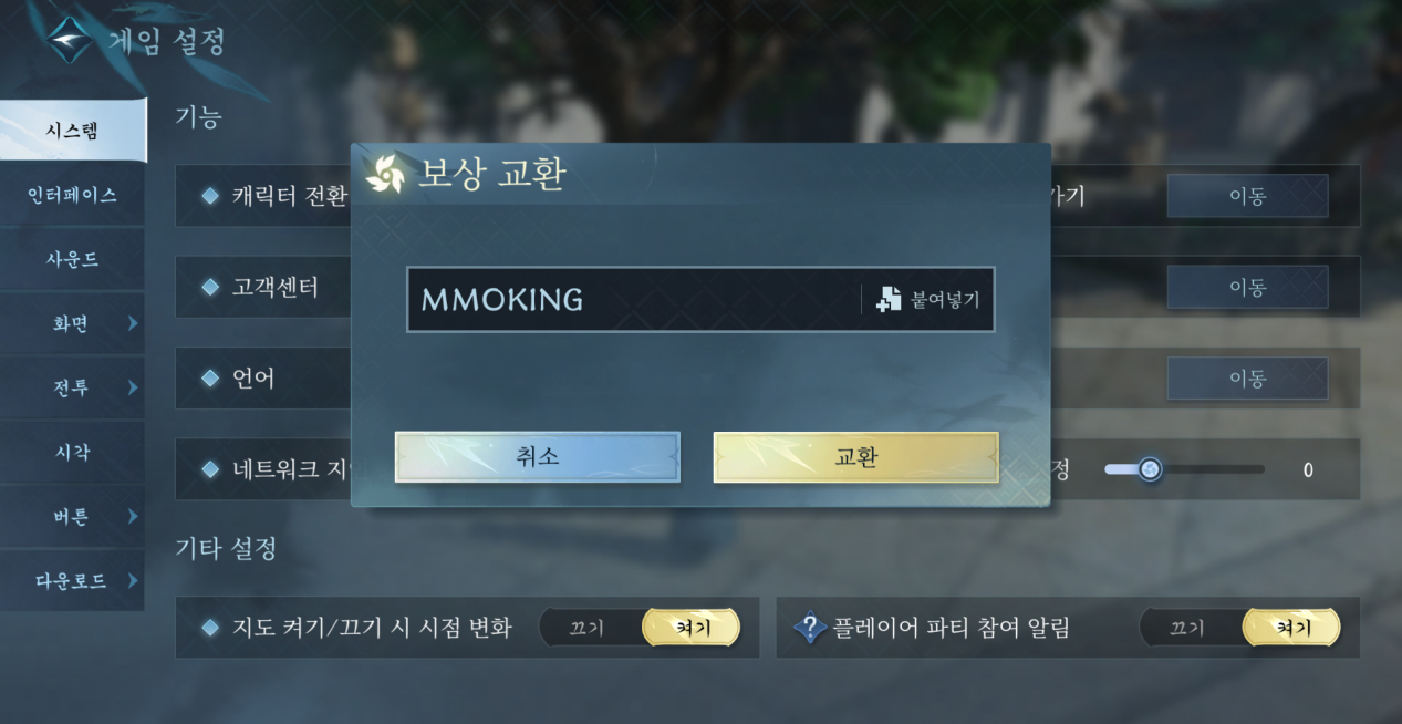 수령 방법: 게임 내 [우측 상단 메뉴]의 [시스템]에서 [보상 교환] 선택 후, 입력란에 패키지 코드 「MMOKING」(대소문자 구분) 입력
