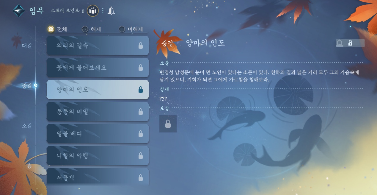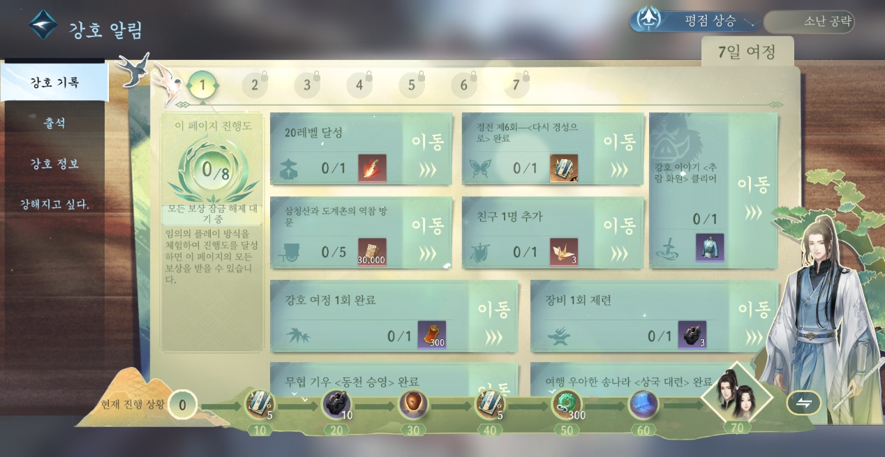 자유도가 너무 높아 어디서부터 시작해야 할지 모르겠다고요? 그럴 땐 메인 화면 상단의 [강호 안내]를 열고 [강호 기록]에서 [7일 여정]을 따라가 보세요.