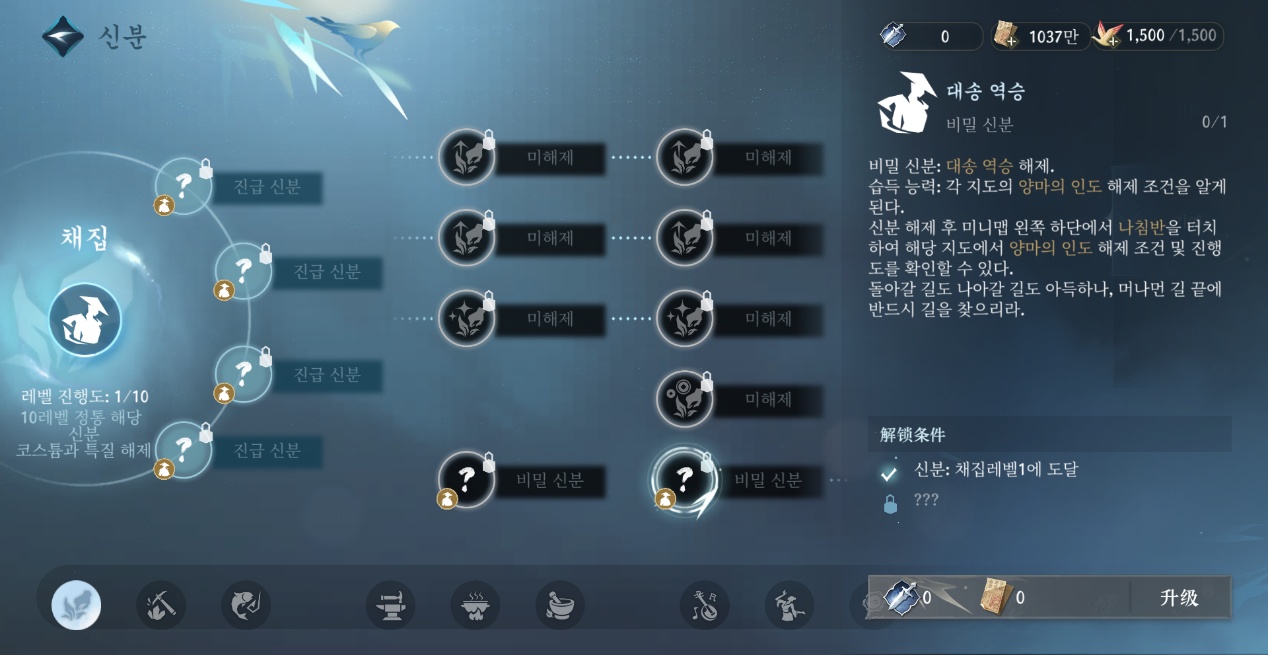 기우를 완료한 뒤, [메뉴 - 신분 - 채집 - 기예 페이지]를 열면 우측 하단에서 [대송 역승]이라는 비밀 신분을 확인할 수 있습니다. 해당 신분을 클릭해 레벨업하세요.