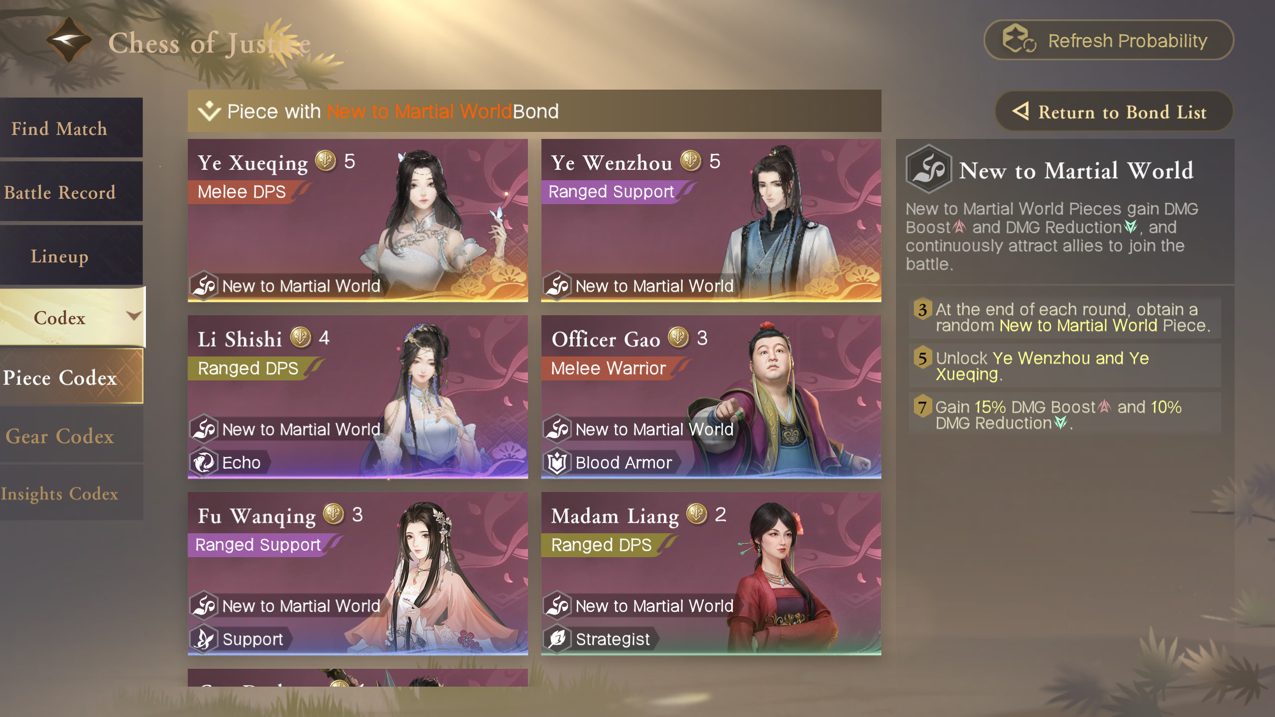 Here gather those you met during your journey of [New to Martial World]—friends and foes alike. Senior Wenzhou and Senior Xueqing will also fight by your side, along with Li Shishi, Fu Wanqing, Officer Gao, and others. Together, they will continually draw one more ally to join the battle, just as their bond name [New to Martial World] suggests, making them a perfect choice for new players.