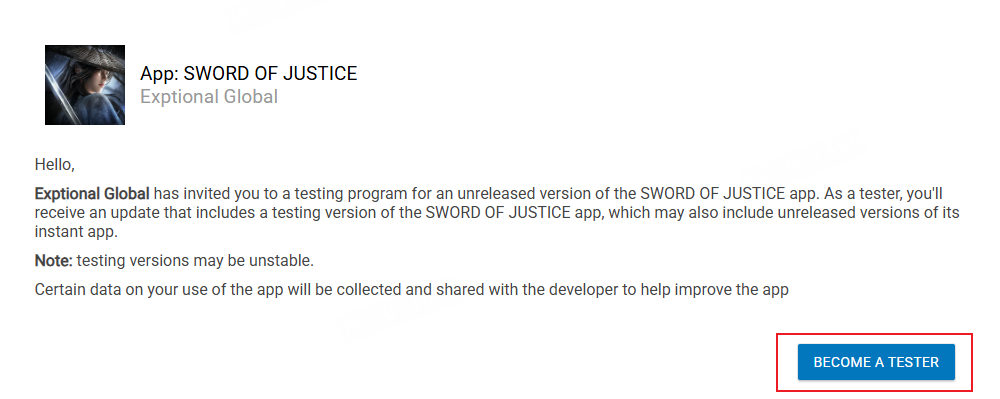 Please check the email you provided during test sign-up, and look for an email from TestFlight <no_reply@email.apple.com> with the subject "NETEASE INTERACTIVE ENTERTAINMENT PTE. LTD has invited you to test SWORD OF JUSTICE."