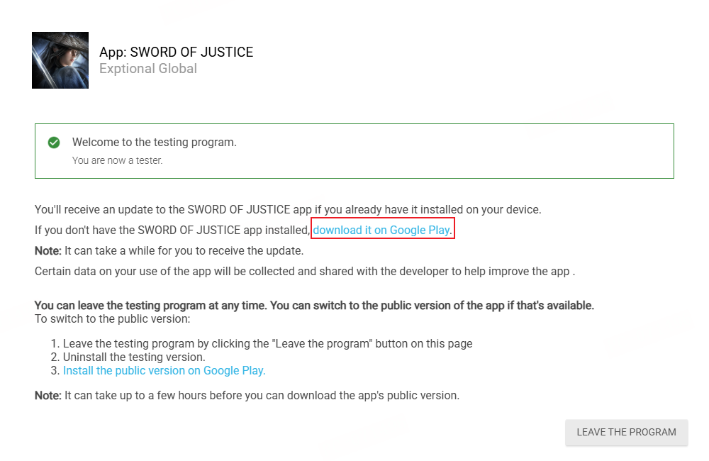 Tap "BECOME A TESTER", and you will be taken to the next page as shown in Figure 2. Tap "Download it on Google Play" to go to the store page and begin downloading.