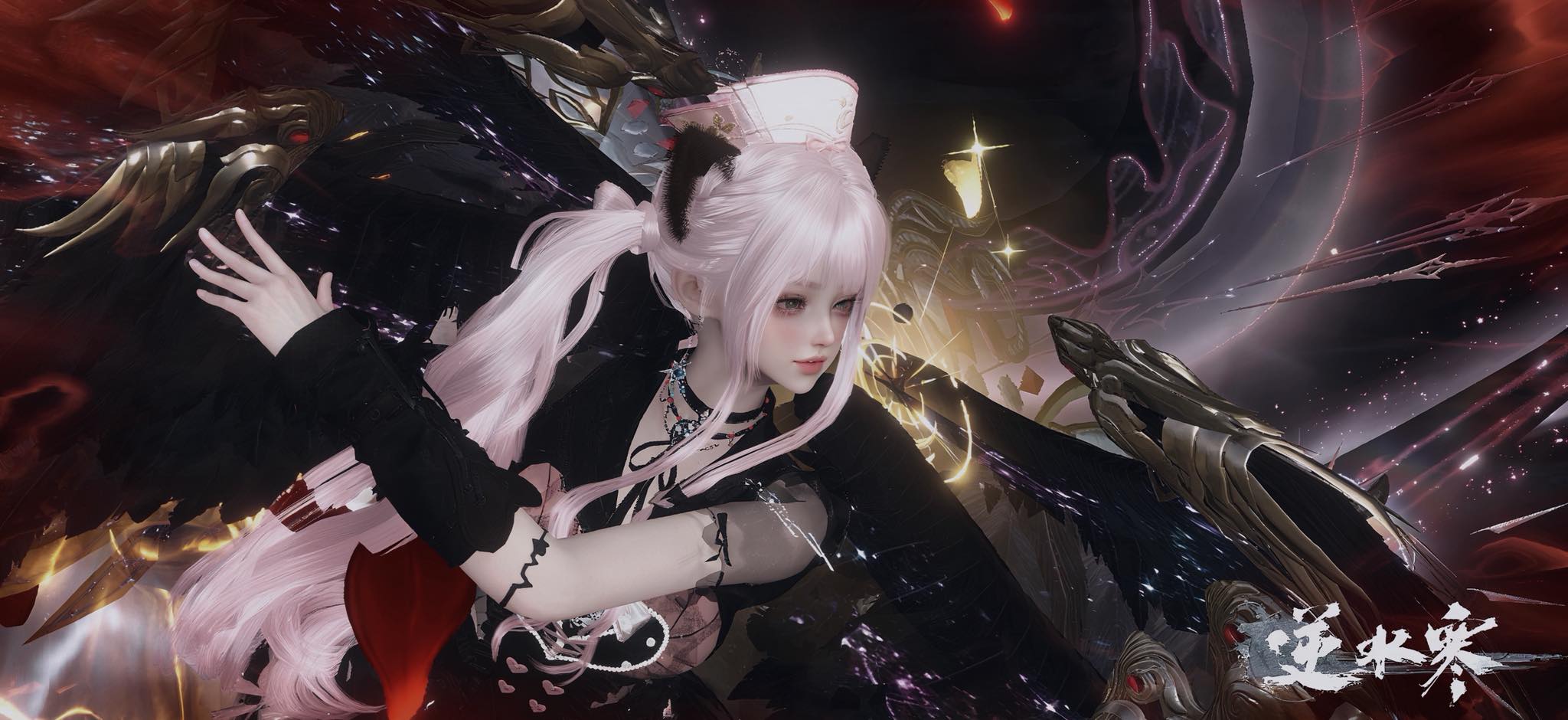 黑色與粉紅的組合,散發出神秘與魅惑的氣息。粉髮少女舞動間展開漆黑羽翼,周圍紅色光流翻騰。強烈的對比色讓場景更顯張揚,像是小惡魔似但卻能治癒人的心!