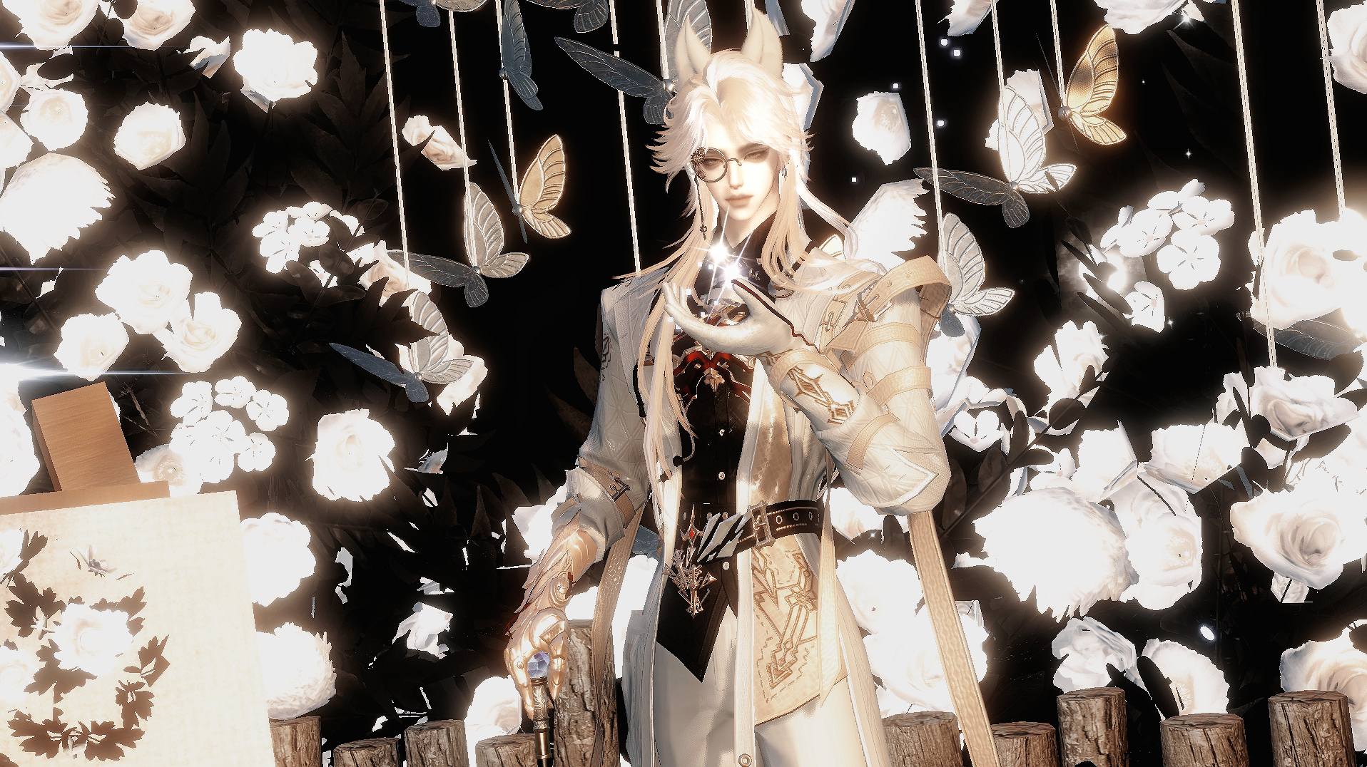 淺金長髮的身影矗立於白玫瑰與蝴蝶之間,氣質優雅如畫。手中光點閃爍,像是掌握著純淨的魔力。白與米金的配色襯托高貴與靜謐。周圍繁花與蝶影搖曳,整體氛圍如夢似幻。