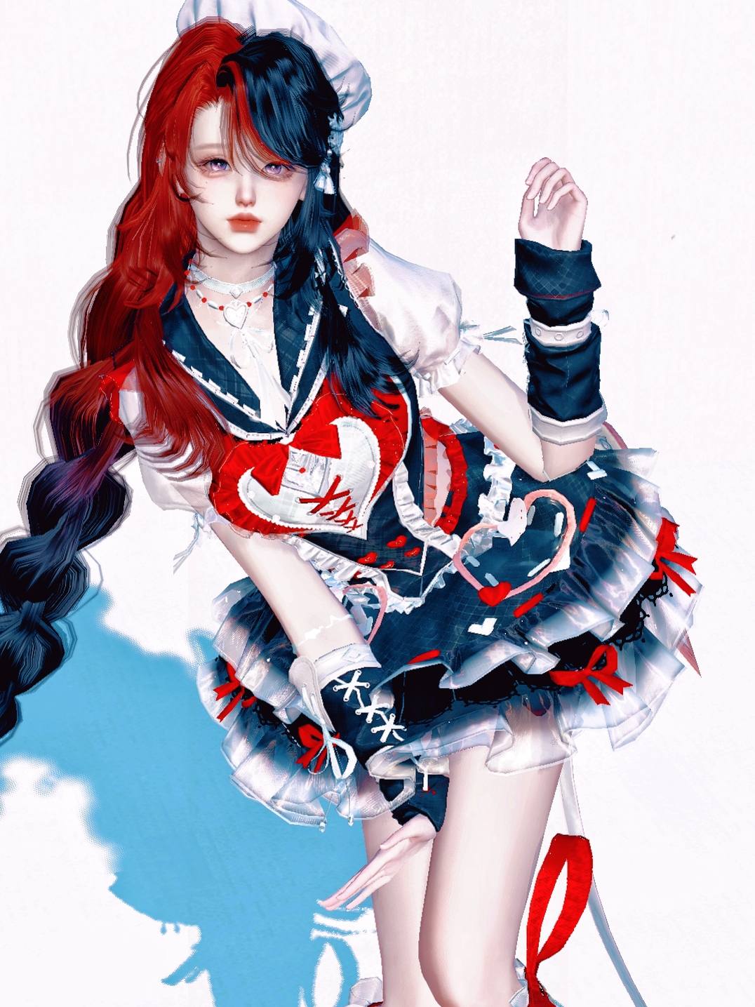 紅與藍的髮絲交錯,形成強烈的對比感。服裝上鮮紅的心形與黑藍底色碰撞,帶來視覺衝擊。她微微俯身,姿態帶點倔強與俏皮。冷暖並存的色彩,展現出獨特而鮮明的個性。