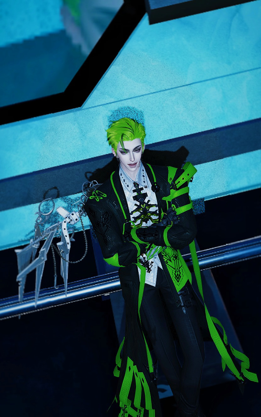 螢光綠與黑色交織的服飾在冷冽的燈光下顯得格外醒目。少年背靠著冰冷牆面,姿態隨性卻自帶張狂氣勢。鮮明的綠髮與銳利眼神,讓整體氛圍充滿叛逆魅力。彷彿在夜色中點燃一抹危險的光芒。