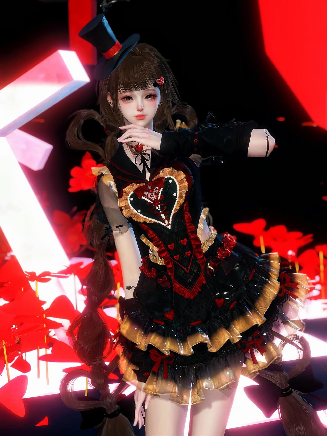 黑金與紅色相互輝映,華麗的禮帽與蝴蝶結細節點綴其間。少女的神情既高傲又優雅,像舞台中央的主角。背景的紅色花海與燈光,烘托出濃烈的舞台感。