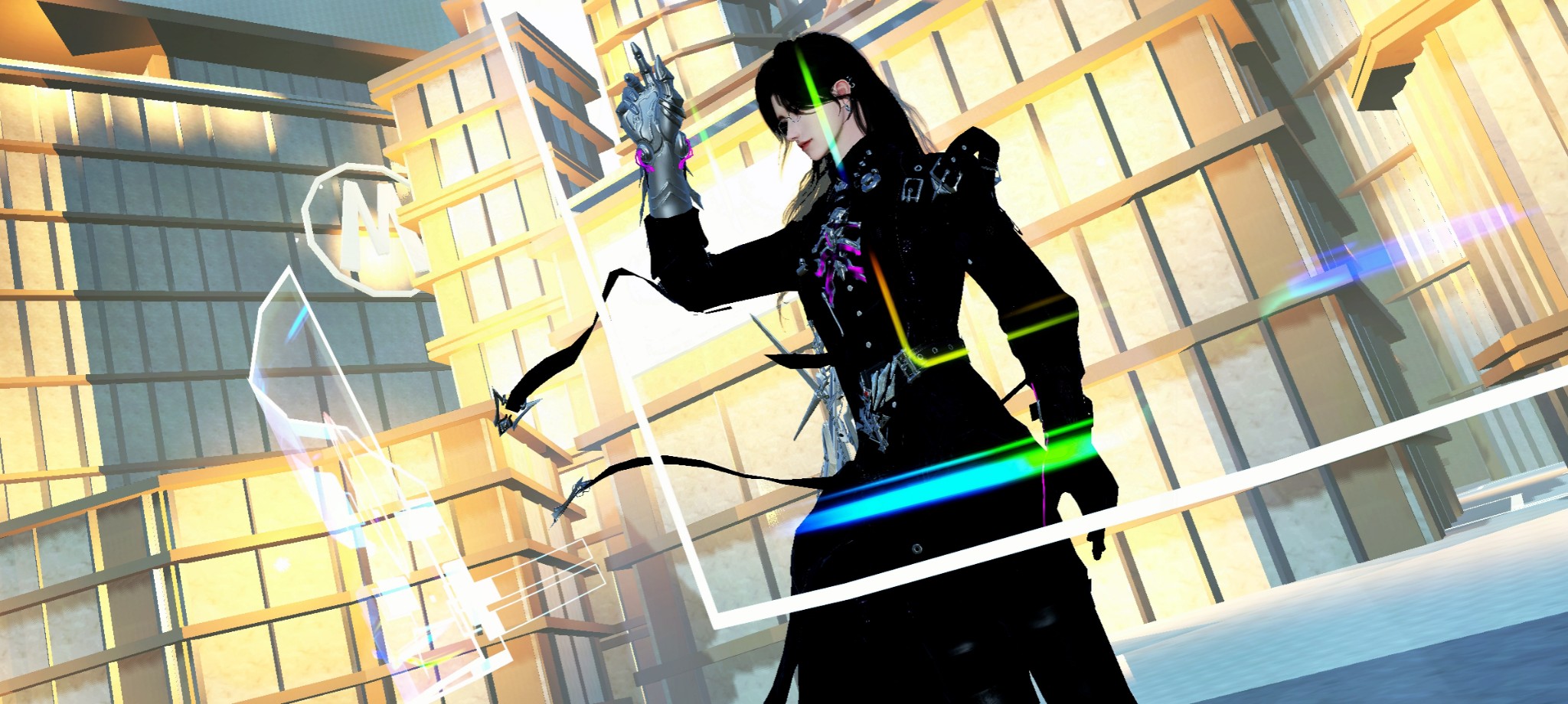 黑色服裝與銀色光芒相互映襯,姿勢冷冽而決絕。背景建築高聳,幾何線條與光影交錯,呈現出未來感。彩光折射在身邊,營造出異能覺醒般的張力。那一瞬間,像是掌控整個戰場的核心。