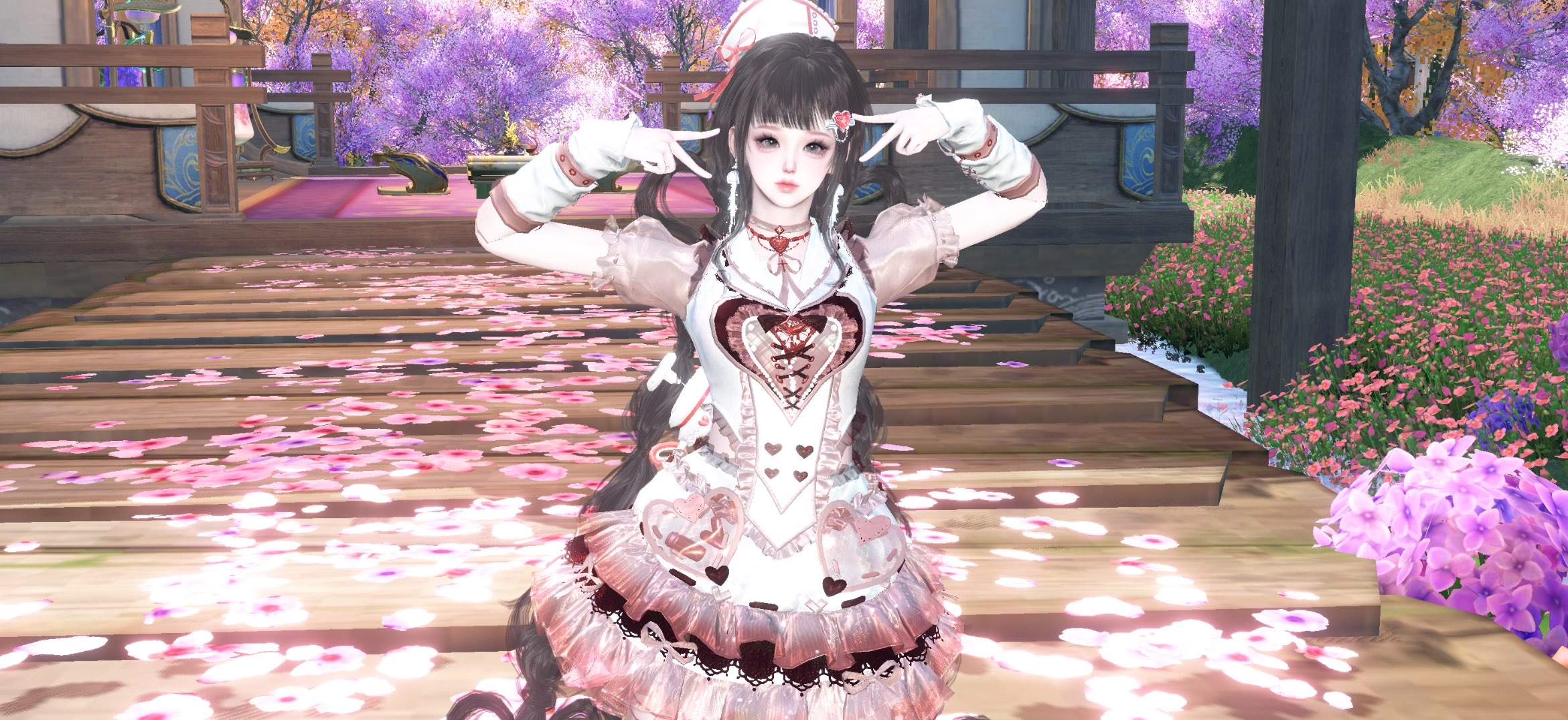 粉嫩花瓣鋪滿木橋,少女身著淺粉與心形圖案的裙裝,笑意間散發春日氣息。雙手比心的姿勢,讓整個畫面顯得俏麗而甜美。背景紫花盛放,襯托出柔和浪漫的氛圍。
