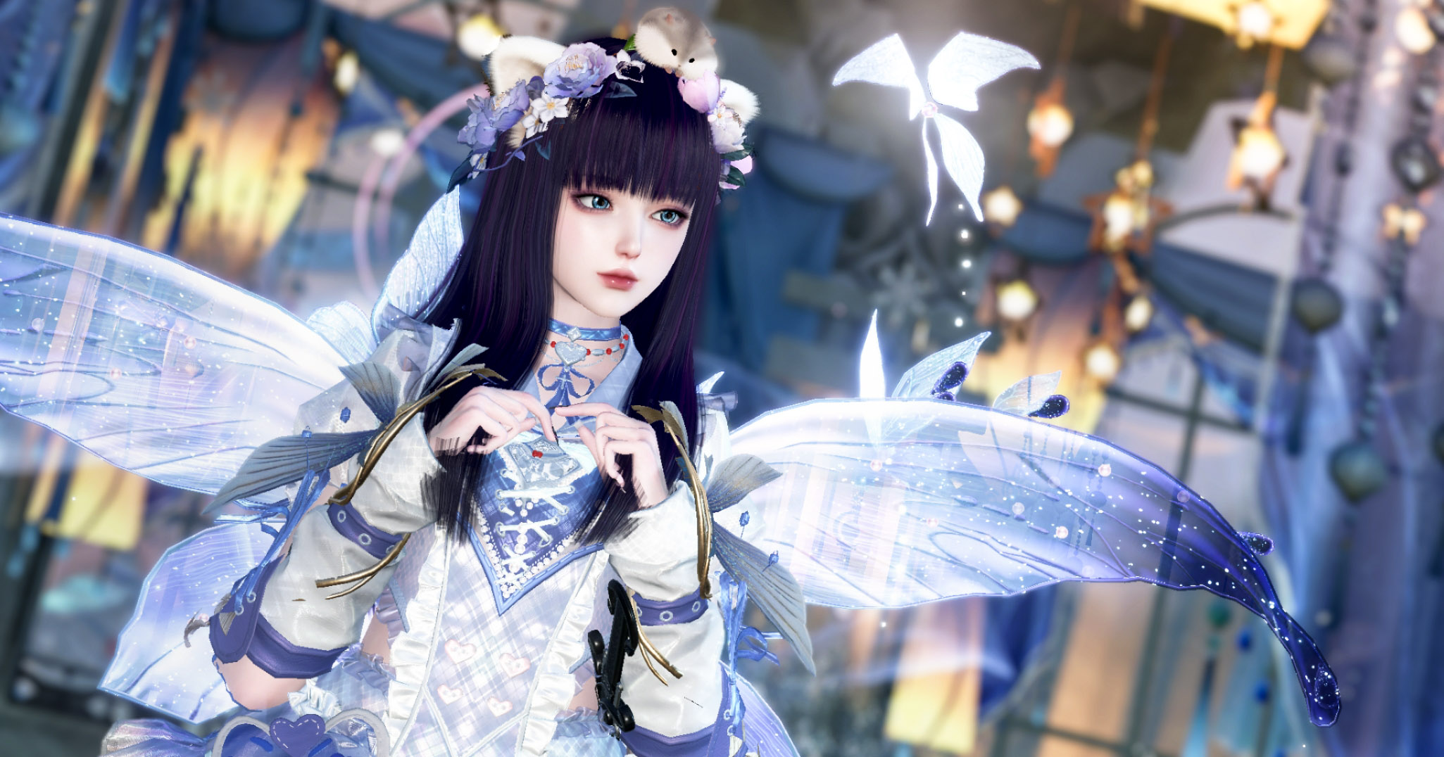 淡藍與銀白交錯的裙裝閃耀著光點,宛如夜空中的精靈。晶瑩剔透的翅膀微微展開,散發夢幻光暈。頭上的花環增添純真可愛氣息。她凝視遠方,像守護著一段不滅的祈願。