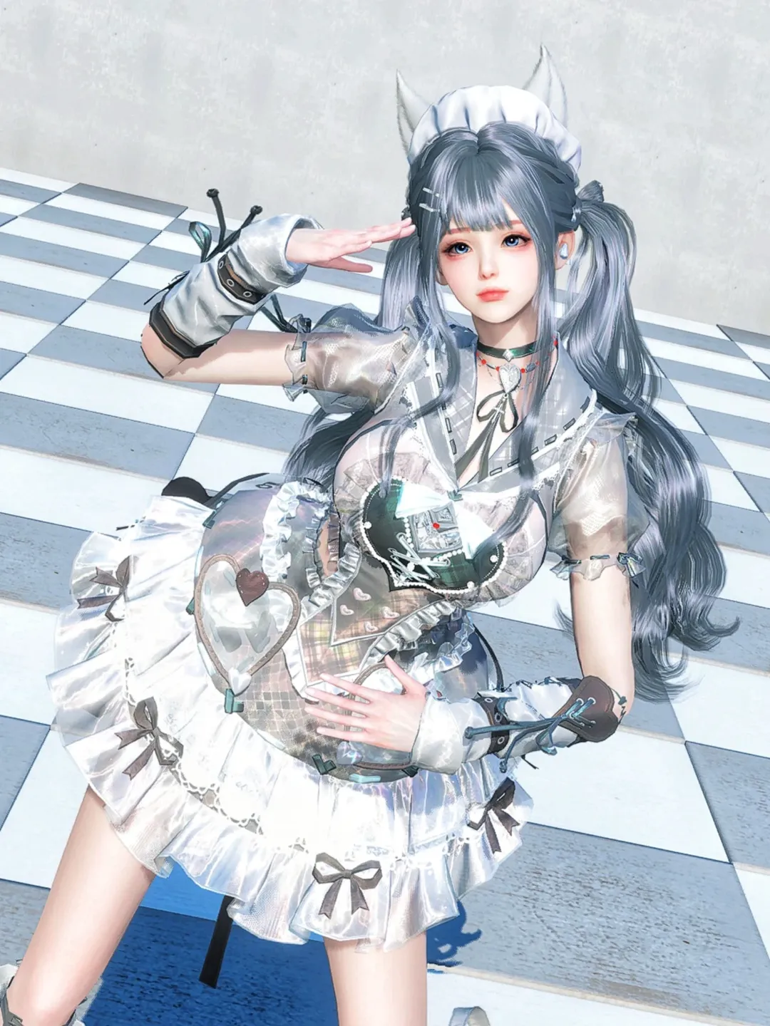 銀白色澤的裙裝閃閃發亮,搭配雙馬尾髮型,帶出清冷的氣質。黑色蝴蝶結點綴其間,讓細節不顯單調。棋盤格的背景增添時尚感,像是一場高級走秀。她的笑容中帶著一絲俏皮。