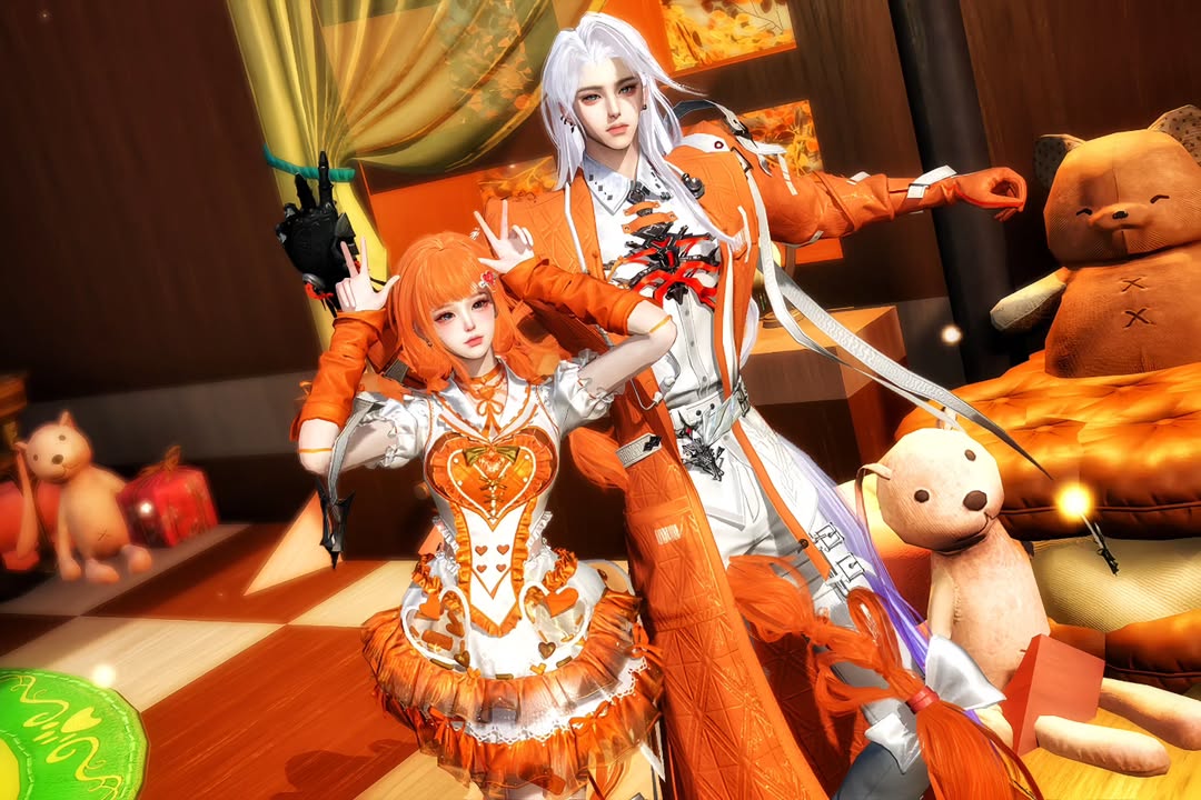 鮮橙色的服裝與場景相呼應,散發活力與溫暖。少女與白髮少年的搭配,營造甜蜜歡快的氛圍。橙色的心形與飾品點綴,使整體更顯俏皮。兩人的笑容,宛如秋日陽光般燦爛。