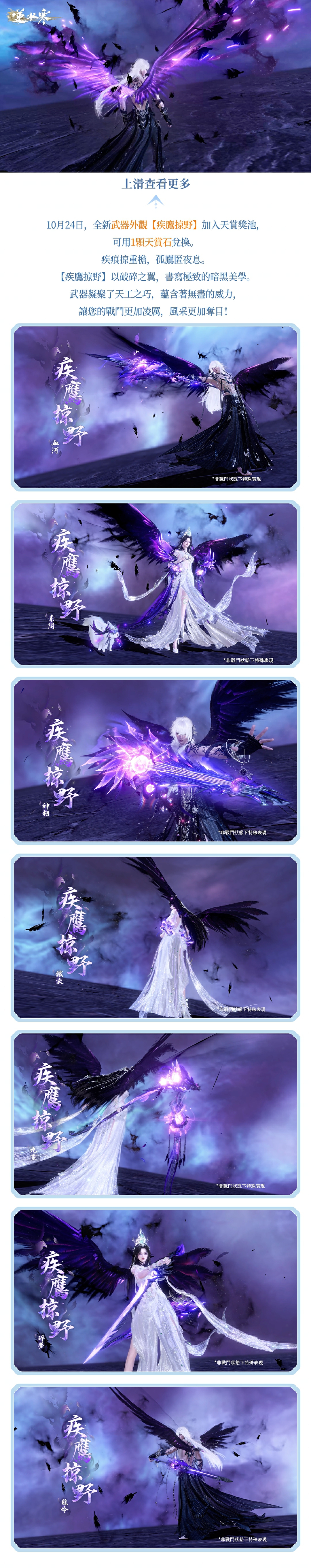 閃耀降臨!【疾鷹掠野】以紫焰為翼,展開破碎冷冽的暗黑之姿,黑羽輕顫間,惡魔氣場瞬間席捲全場🖤