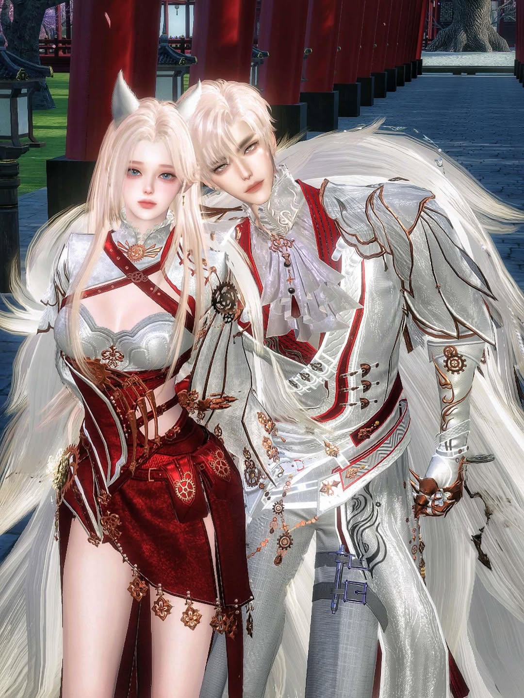 🦊 神社眷侶,紅白守護 紅白配色的情侶裝在銀裝素裹的背景中格外耀眼。兩人親密的姿態與精緻的狐耳裝飾增添了幾分俏皮與溫柔,畫面色調和諧,彷彿一對守護著古老神社的神靈眷侶。