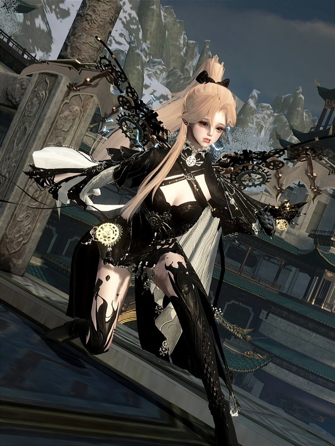 🧐 精密計算,冰山冷酷 高馬尾展現了俐落感,而眼部的齒輪單眼鏡片則是畫龍點睛之筆。紅黑交織的時裝剪裁銳利,紅色的袖口與眼眸顏色呼應,展現出一種冷酷且嚴謹的特殊美感。