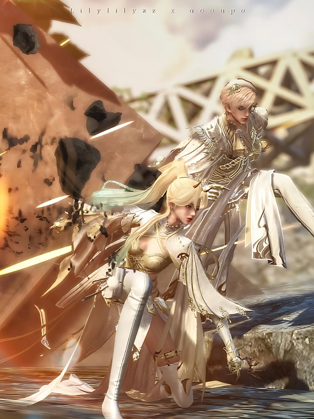 ✨ 戰火聖歌,優雅降臨 淡金色與純白的配色顯得神聖不可侵犯,與背景中飛濺的碎石、火光形成強烈對比。角色半跪的姿態極具張力,展現了一種在混亂中依然保持優雅的強大氣場。