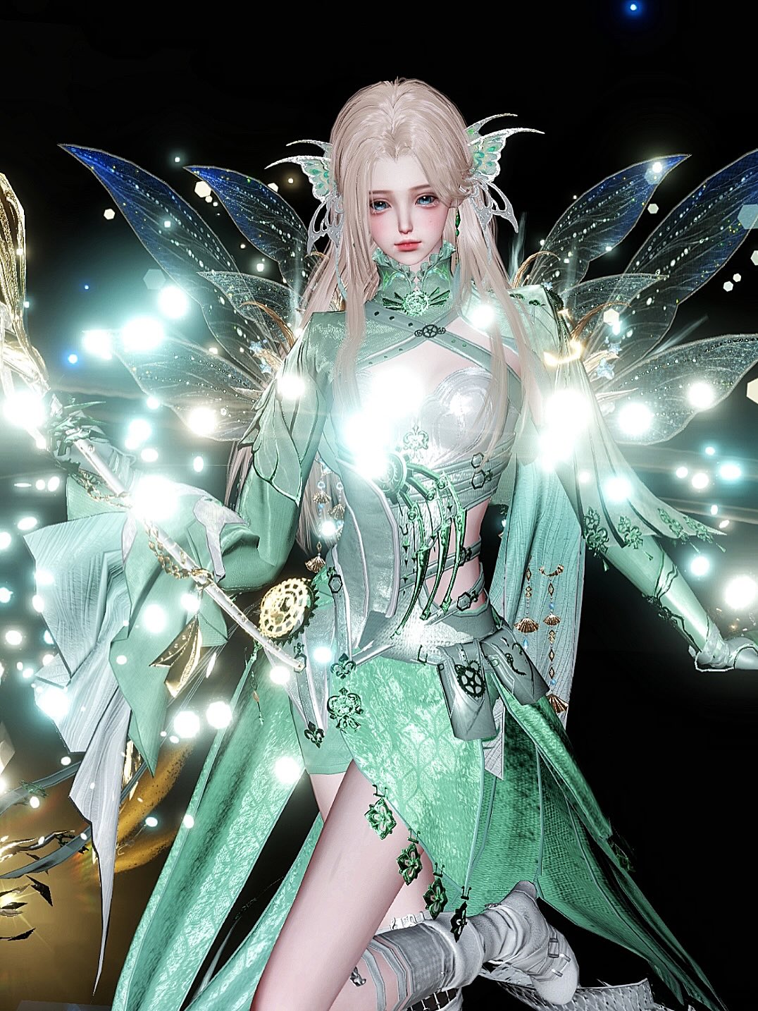 🧚♀️ 薄荷仙氣,迷霧精靈 薄荷綠與銀色的搭配清新脫俗,背後的半透明翅膀散發著螢光,彷彿角色正從迷霧森林中緩緩走來。閃爍的螢光點點讓畫面充滿了靈動的仙氣。
