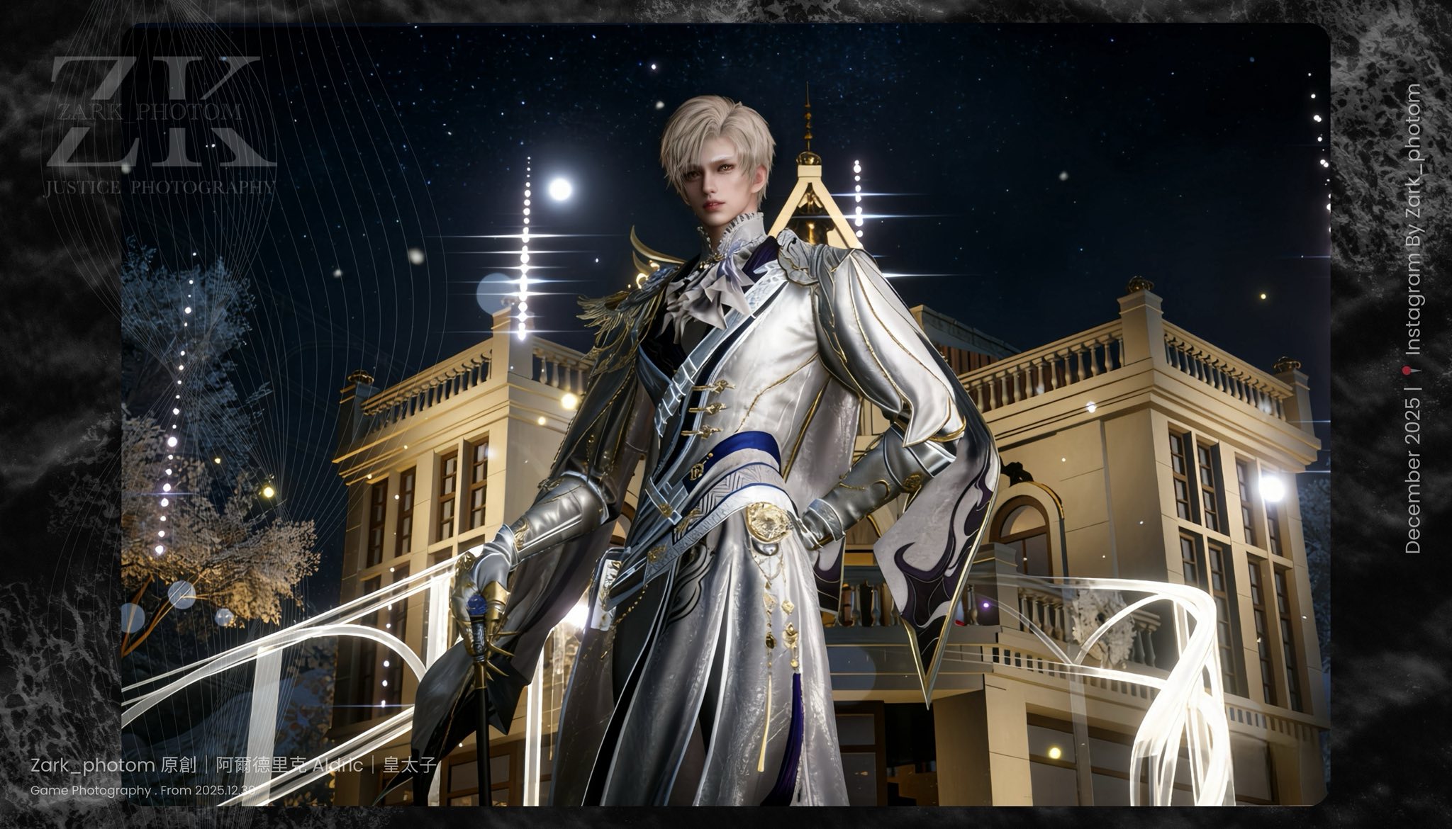 🏰 皇室氣度,白金戰袍 角色穿著剪裁精良的白金戰袍,在繁星點點的夜空與歐式宮廷建築前駐足。絲綢般的布料質感在月光下閃耀,完美詮釋了什麼叫作「矜貴」與「皇室氣度」。