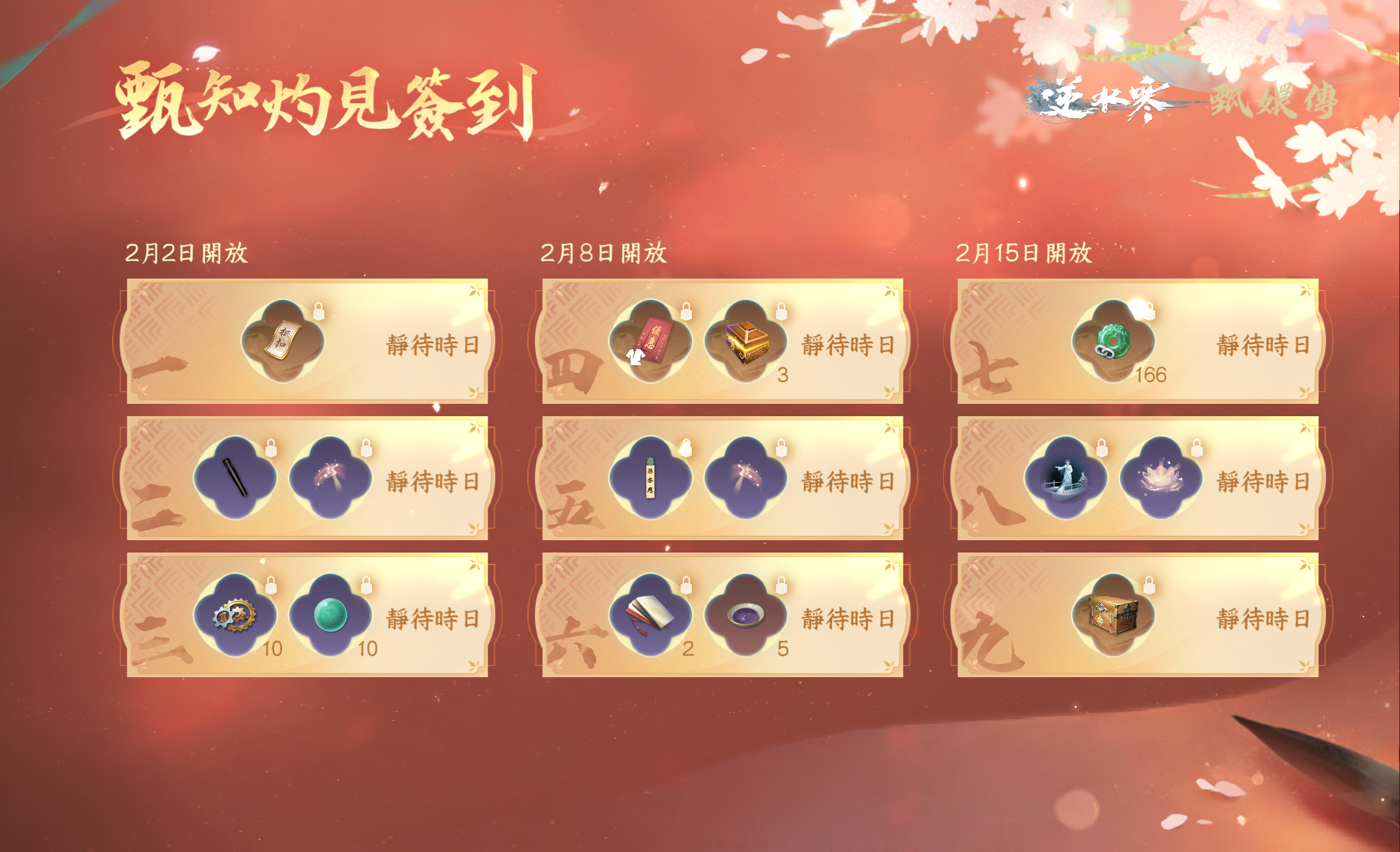 2月2日,【甄知灼見】簽到活動同步上線,參與活動即可免費獲得專屬【雙人動作】泛舟湖上及【掛飾】長相思琴、【掛飾】綠頭牌等多樣精美好禮🎁。
