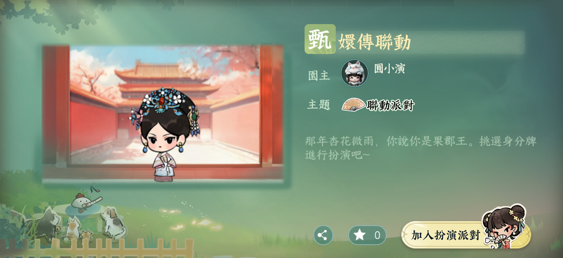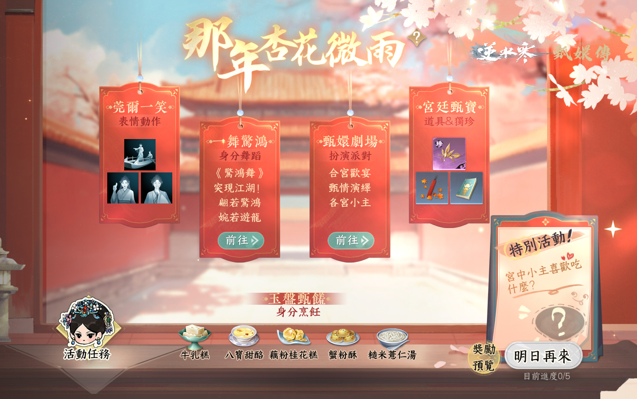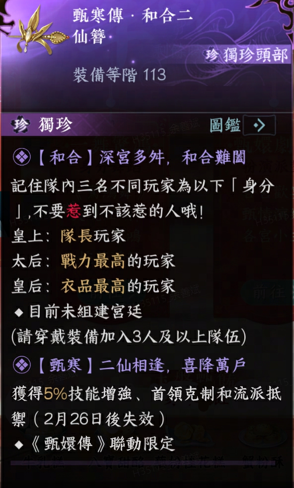 2月2日起,參與【玉盤甄饈】活動,完成太后、甄嬛、眉姐姐、華妃、祺嬪五位貴人的身份要求後,可解鎖【動作】臣妾要告發熹貴妃、【掛飾】赤色鴛鴦肚兜、【掛飾】長相守笛、【身份-工藝配方】華妃,一丈紅(據說對其他人使用後,能為楓葉增添一抹鮮紅之色)、【身份-工藝配方】三阿哥,巨人秘笈(據說是宮裡流傳出來的秘笈,能使修習者在短時間內逐漸長高,即便成年亦可生效)。