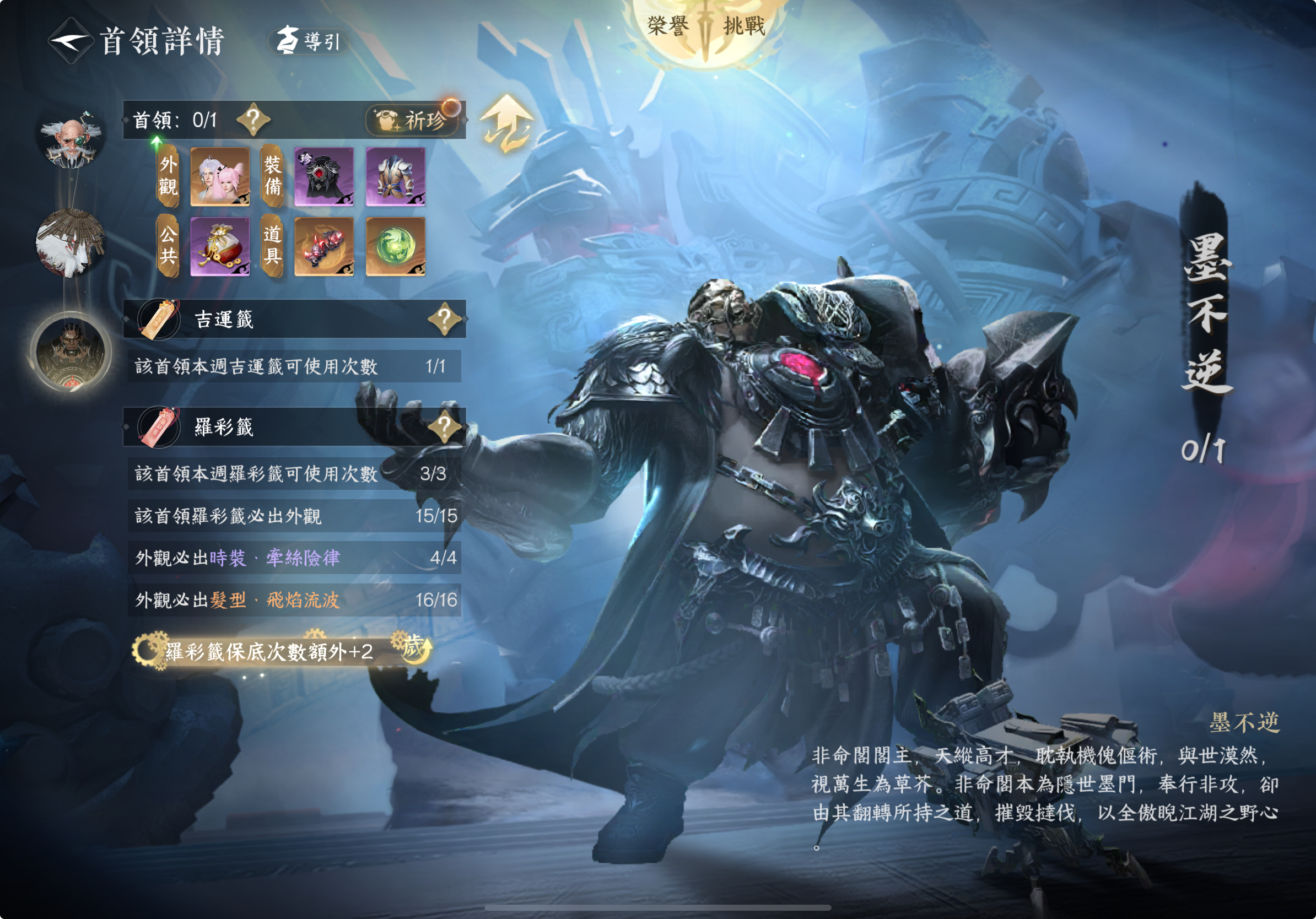 非命閣閣主 【墨不逆】 坐鎮關底,機制更複雜、傷害更強大。請各位同門備好藥品、確認裝備,集結隊友前往挑戰,證明你們的實力👊