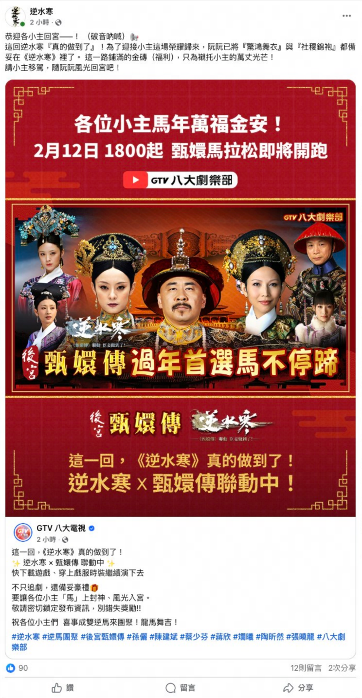 省錢買完衣服,穿得美美來看劇!今晚18:00起,八大電視將在YouTube開啟《後宮·甄嬛傳》馬拉松連播!逆水寒獨家冠名,不僅直播中花式刷臉;萬人線上聊天室同步開放,華妃在劇裡宮鬥,大家在聊天室裡蔣欣梗,沉浸式陪伴同門追劇~