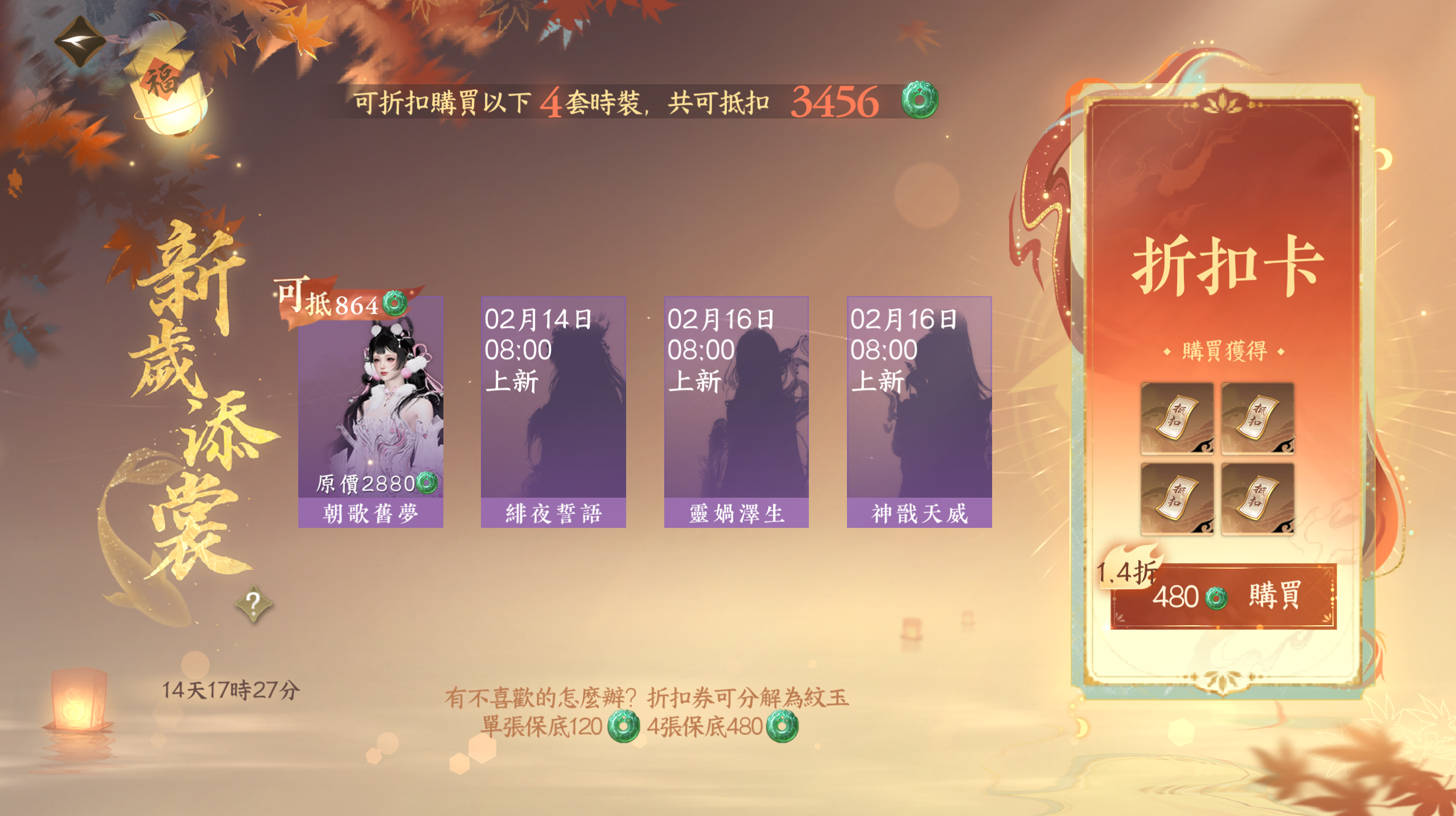 即日起 ~ 2 月 27 日 05:00 開啟新歲添裳活動,花費480紋玉,就能領到價值3456紋玉的專屬時裝代金券,相當於720%回饋!專屬時裝代金券共四張,每張可抵扣864紋玉,可用於購買新春上新的2880紋玉時裝及禮盒。