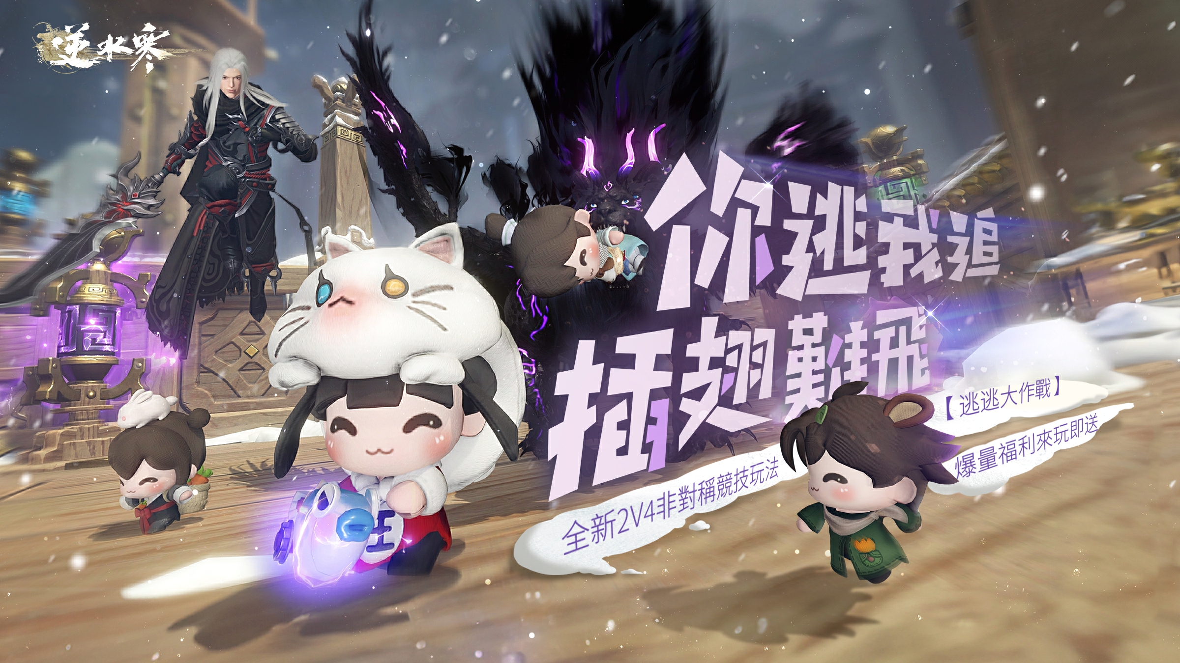 全新2v4非對稱競技玩法【逃逃大作戰!】登場!2月27日後,玩法開放期間,可以選擇圓萌樂、千相或隨機陣營匹配參與玩法,或成為千相抓捕想要逃跑的圓萌樂丟進水池,強迫它們洗澡,或變身圓萌樂充能元素柱,開啟逃離點。