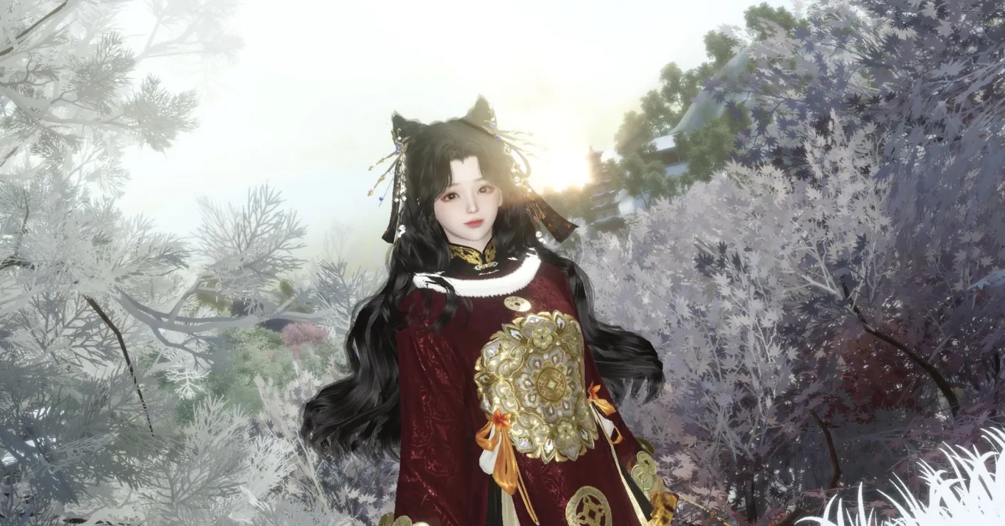 在如夢似幻的銀白雪景中,角色身著深紅織金華服,與清冷的背景形成強烈對比。髮絲間點綴的精緻髮飾與那雙溫柔而堅定的雙眸,彷彿雪地中盛開的一朵紅蓮,既大氣又不失細膩的優雅。