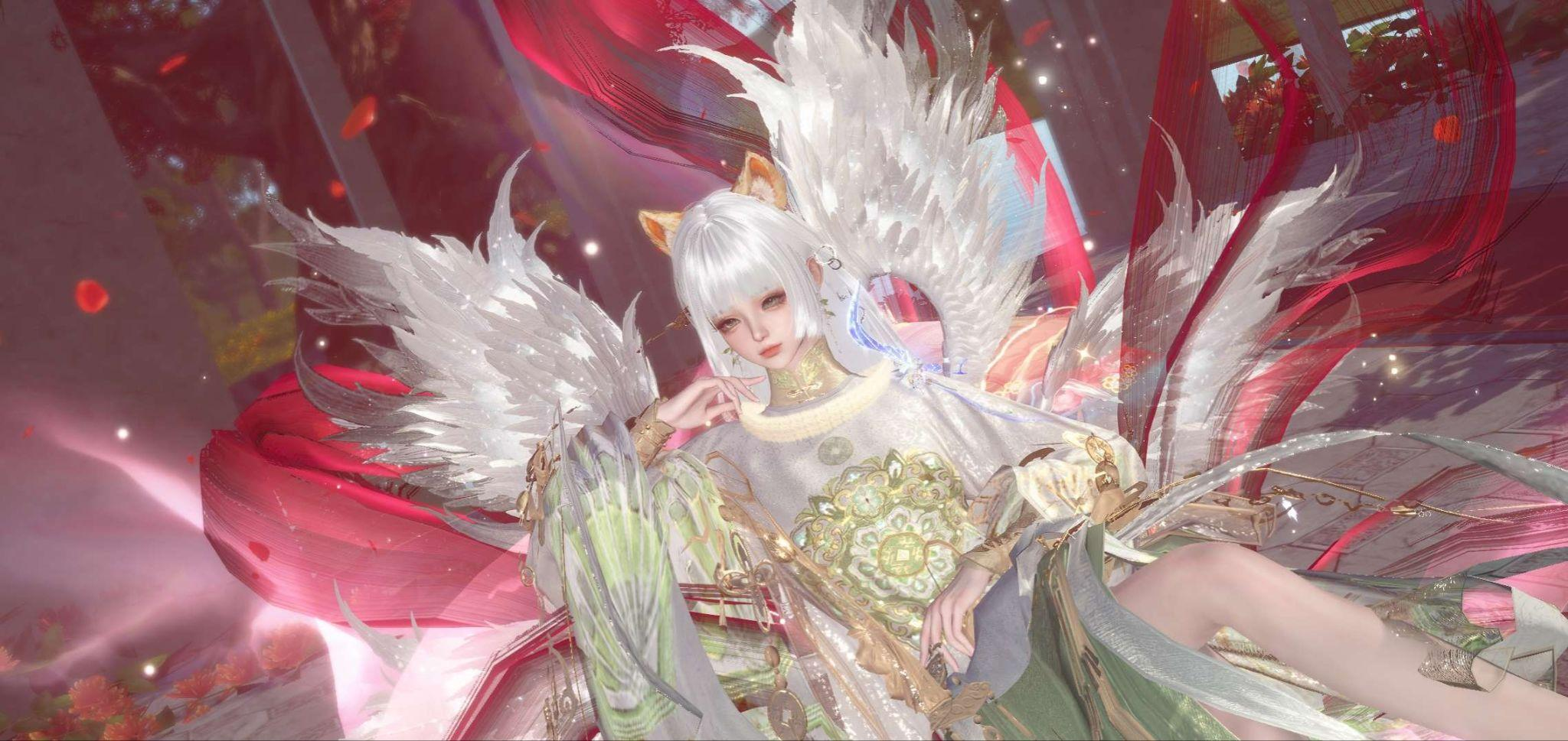 潔白無瑕的羽翼在身後舒展,配合那雙透著慵懶與疏離感的雙眼,彷彿是一位誤入凡塵的九天仙狐。畫面中飛舞的紅綢與角色清冷的白髮交織,構築出一種如夢似幻的視覺饗宴。