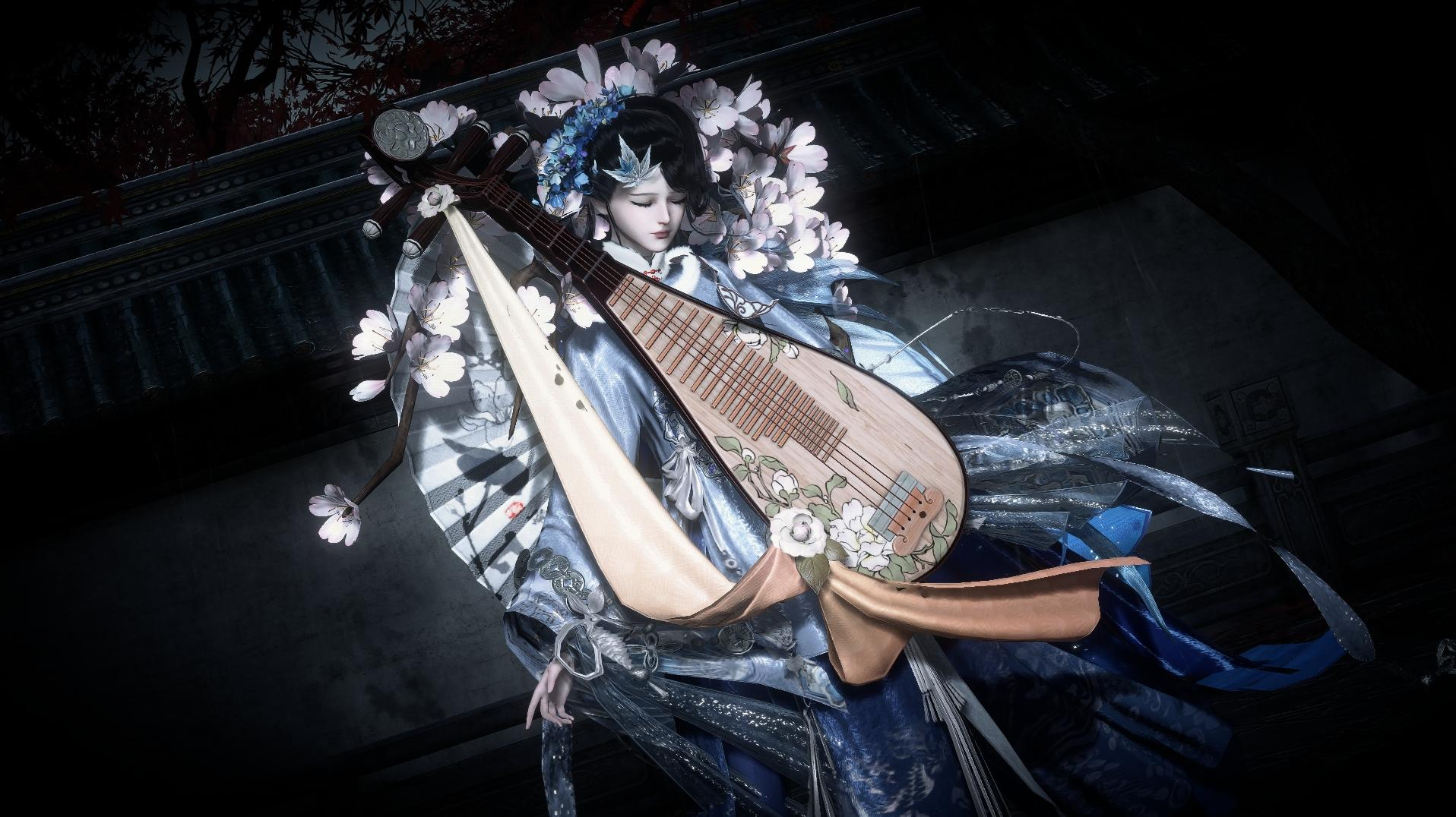 角色懷抱琵琶、低眉垂目的姿態,將憂鬱美感發揮到淋漓盡致!髮絲間點綴的花朵與琵琶上的彩繪,在暗影中流轉著細膩的光澤,充滿了故事感。