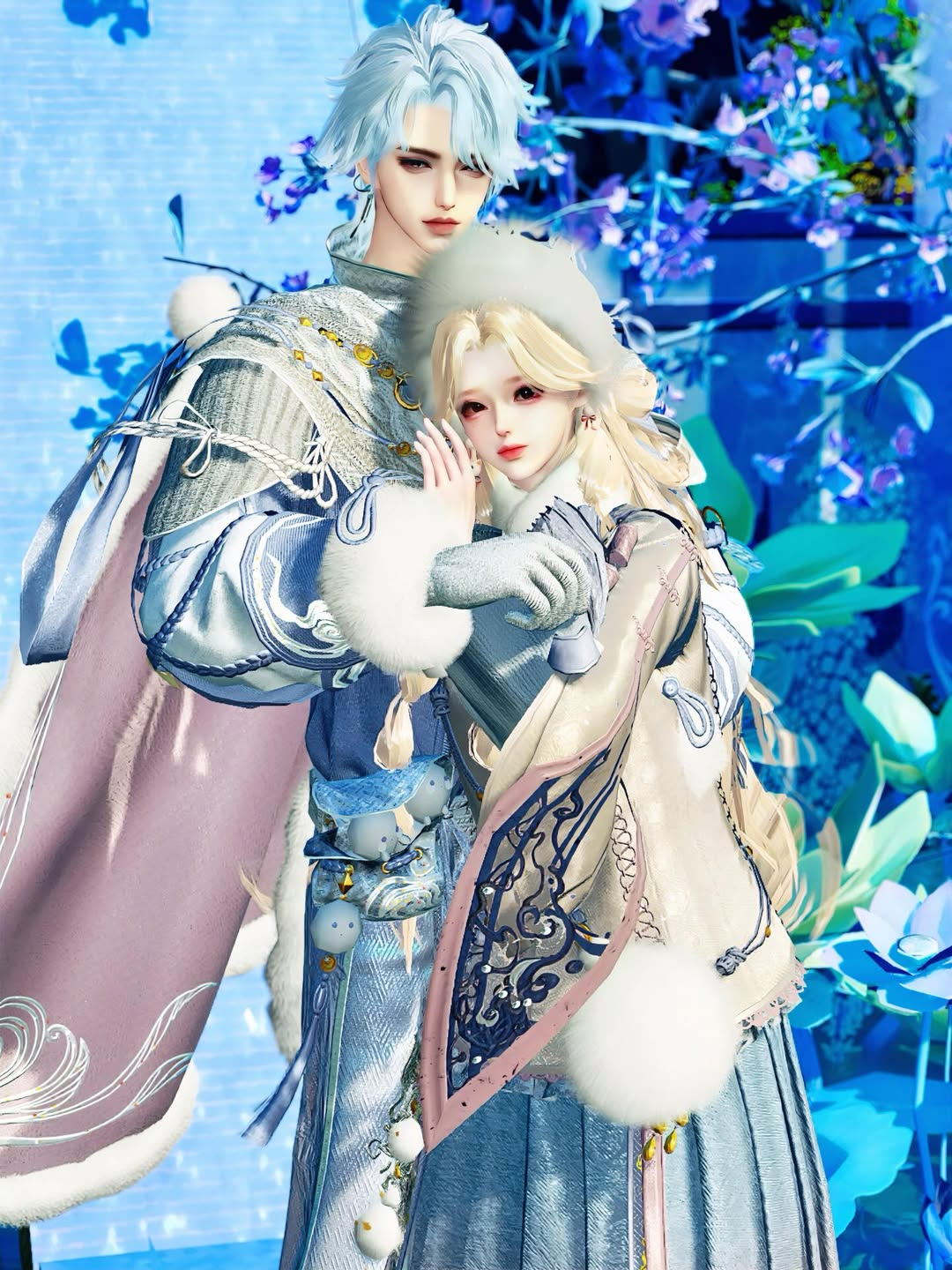 這是一幅極其治癒的冬日畫卷。兩位角色相互依偎,銀白色的髮絲與厚實的絨毛披肩散發著溫暖的氣息。那種眼神中流露出的深情與純淨,讓整個畫面充滿了浪漫與詩意。